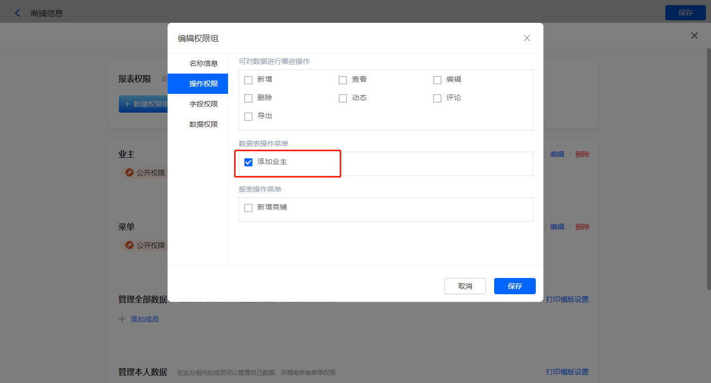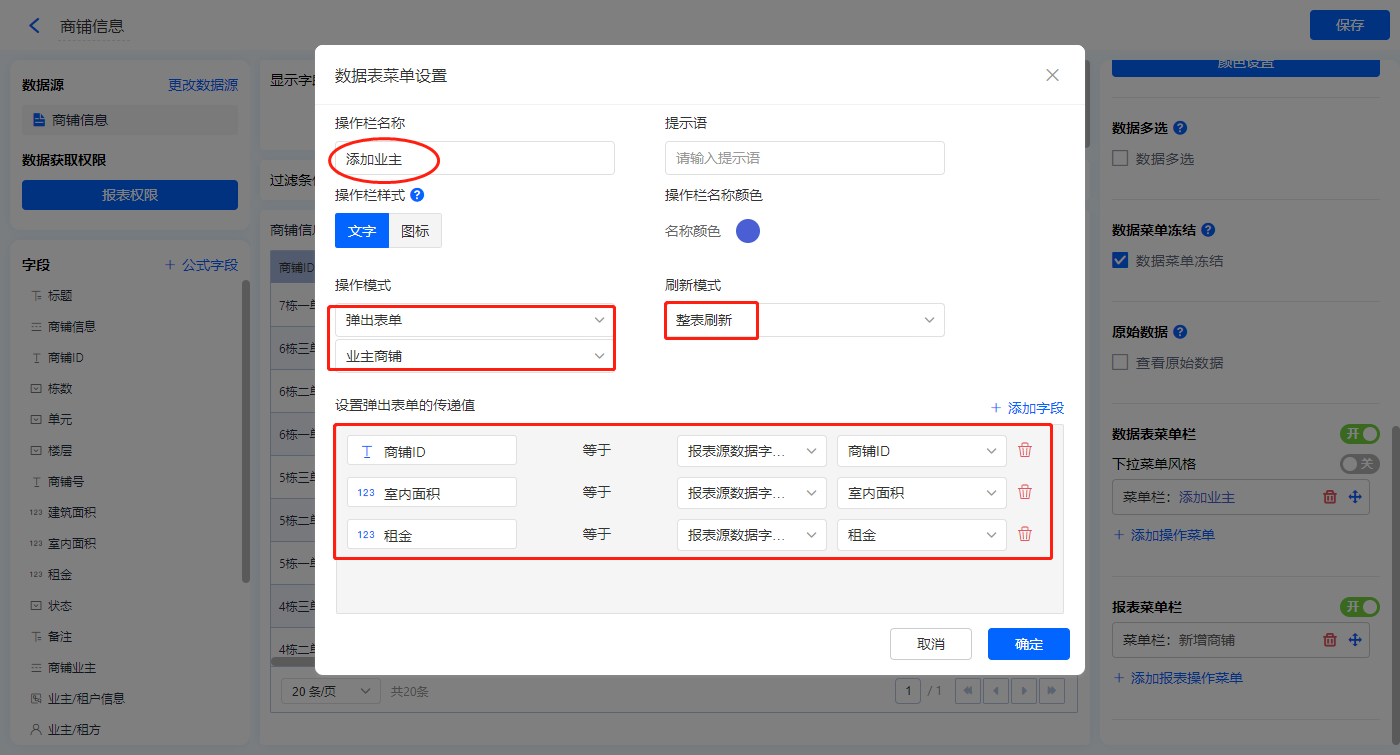 【添加业主】菜单栏,操作模式设置为弹出表单【业主商铺】;
