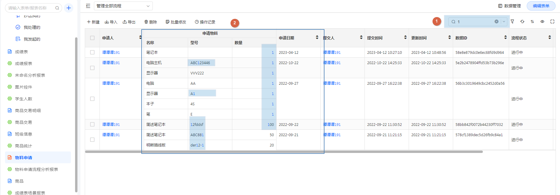 表单权限组-数据管理(权限组下数据表格均支持搜索)
