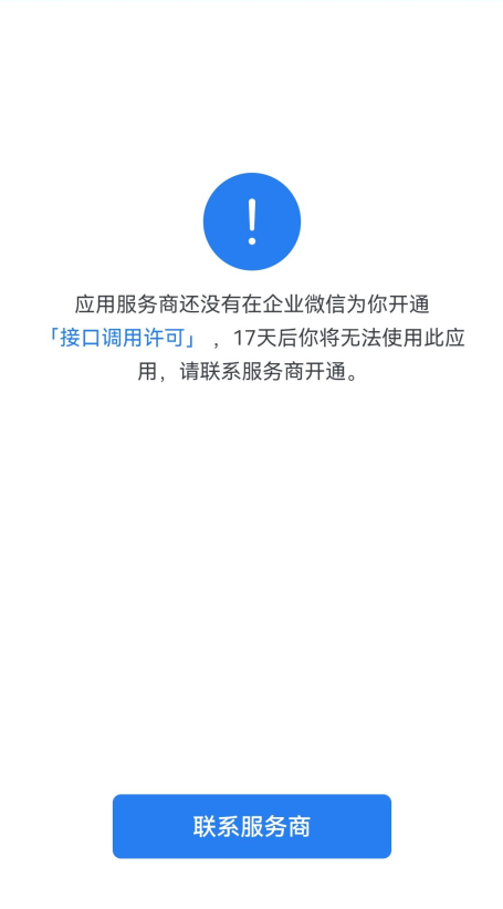 2022年5月9日时,企业微信在一份公告中明确提出,要按照平台接口调用许可,向服务商进行收费。为应对此项调整,针对部分使用企业微信接口的用户,按照企业微信收费标准进行收费。 为保障正常使用,当出现以下提示时,需在规定时间内尽快进行缴费:
