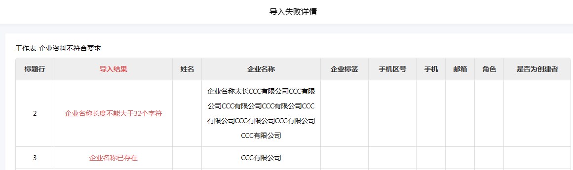 | 企业名称已存在 | 企业名称已存在,说明已经导入过,无需重复导入 |