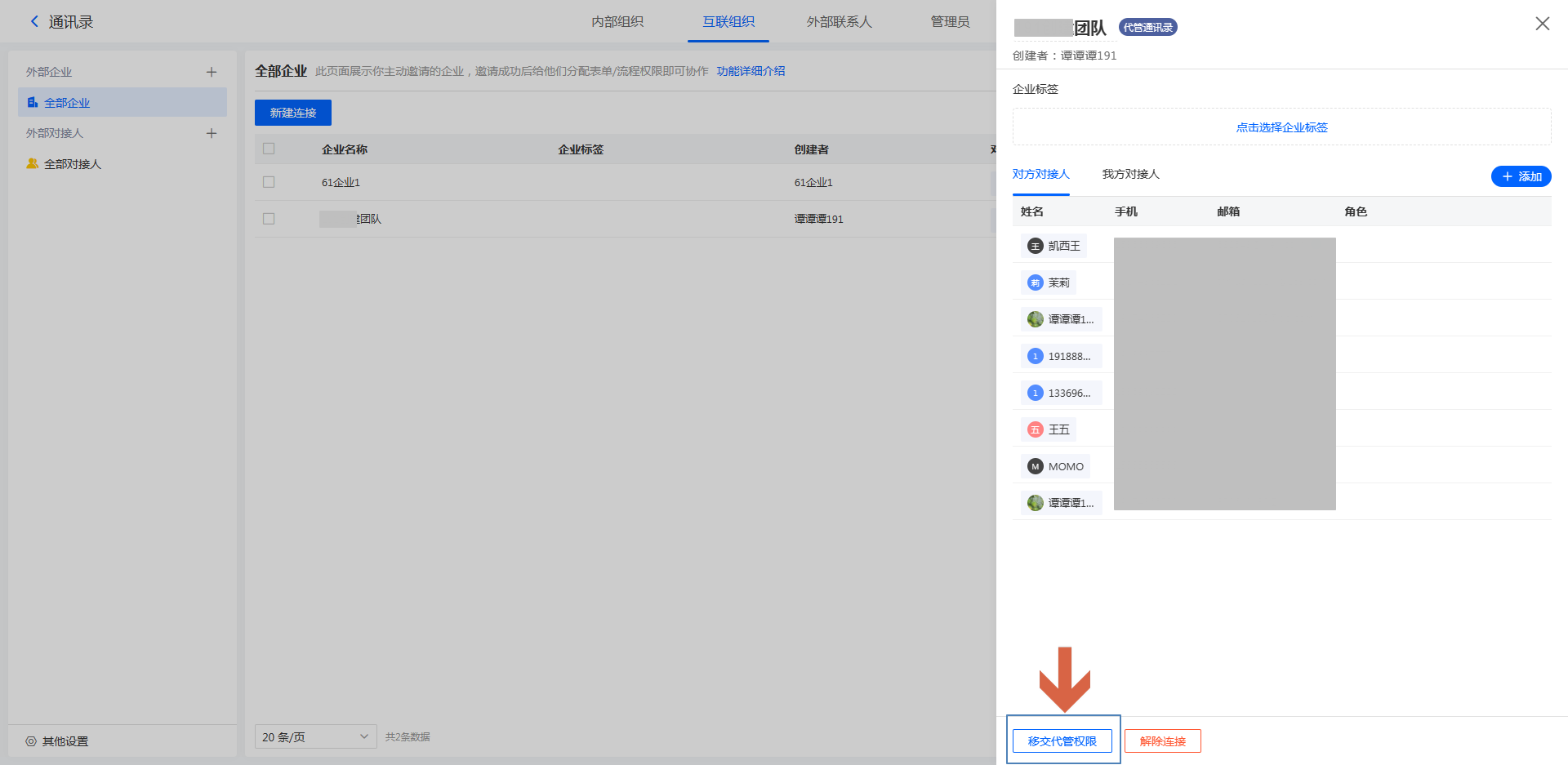 拥有代管权限的企业,可以管理代管企业的通讯录,支持管理内部组织和外部联系人。