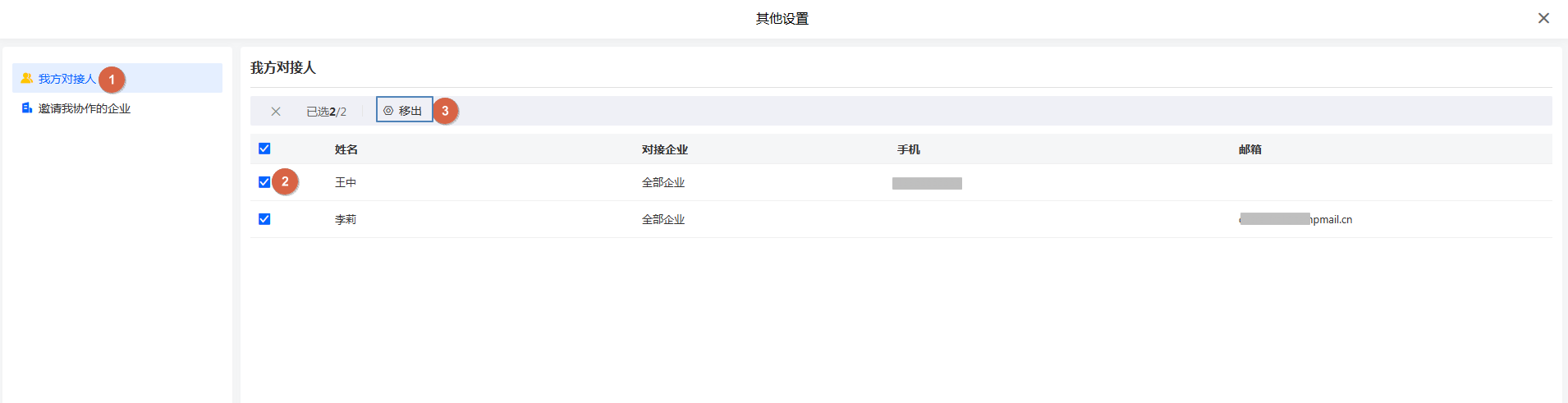 直接在对接人的列表选中需要移除的对接人移除,如下图所示: