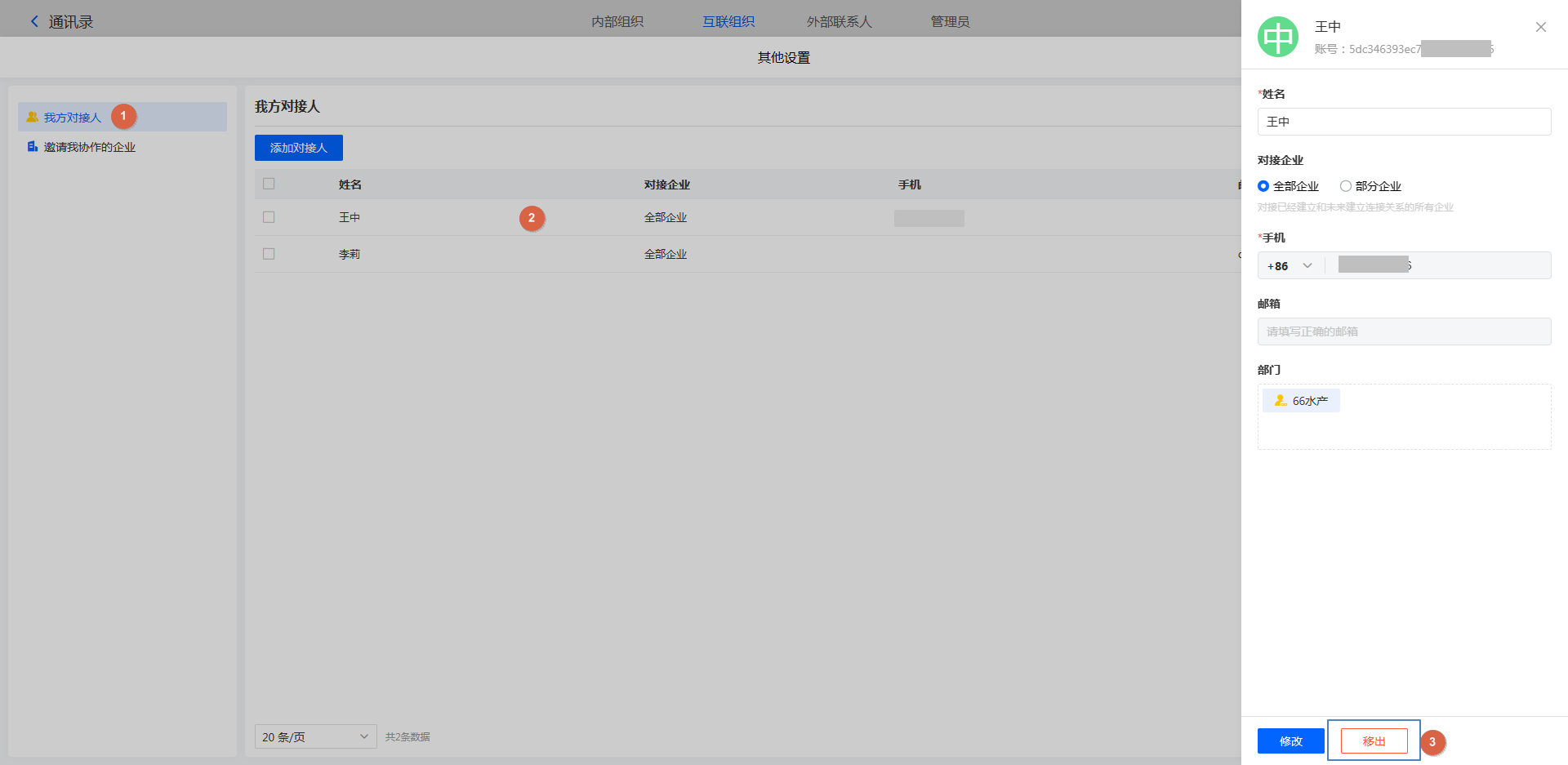 注意:只有内部成员可以设置为对接人,外部联系人不可设置为对接人;即外部联系人不参与企业互联的任何业务。