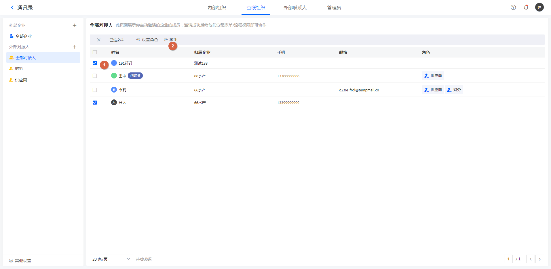 注:移出后,对接人无法再参与此角色相关的外部企业协作,但不会删除移出的对接人,可在全部对接人处继续设置角色。