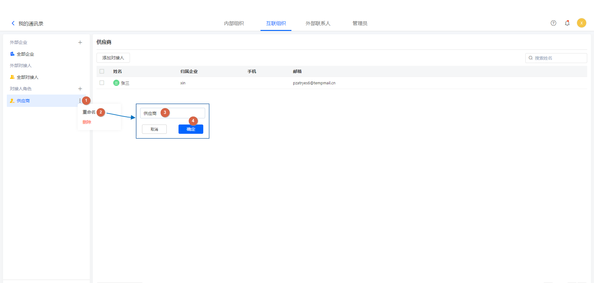 全部对接人列表中,显示了互联组织中的对方对接人。