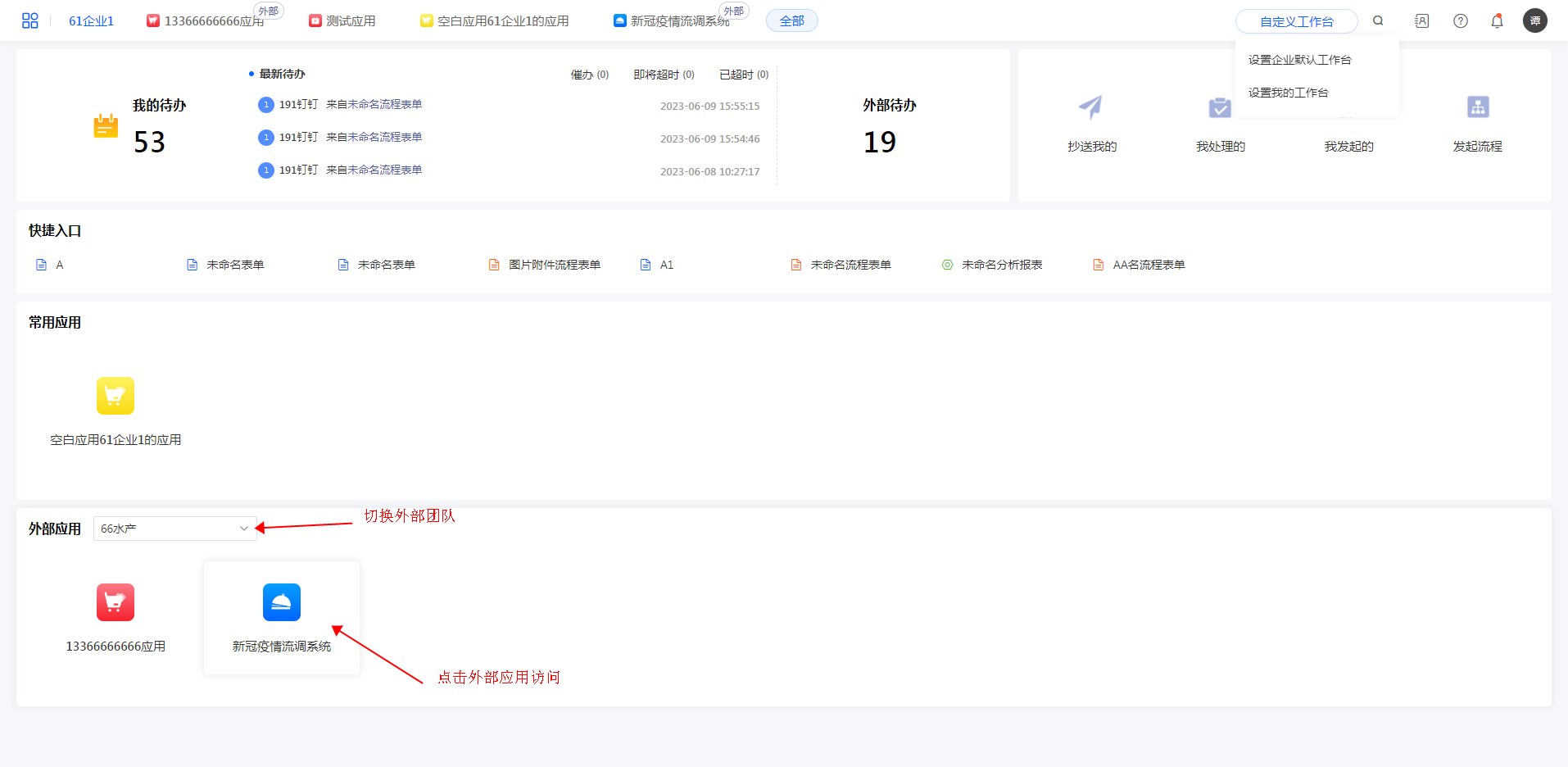 1、可在工作台->外部应用下,切换外部团队,选择外部应用访问。