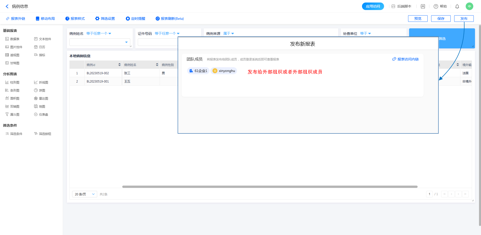 第二步:在报表设计页面,发布给互联组织的成员或部门。