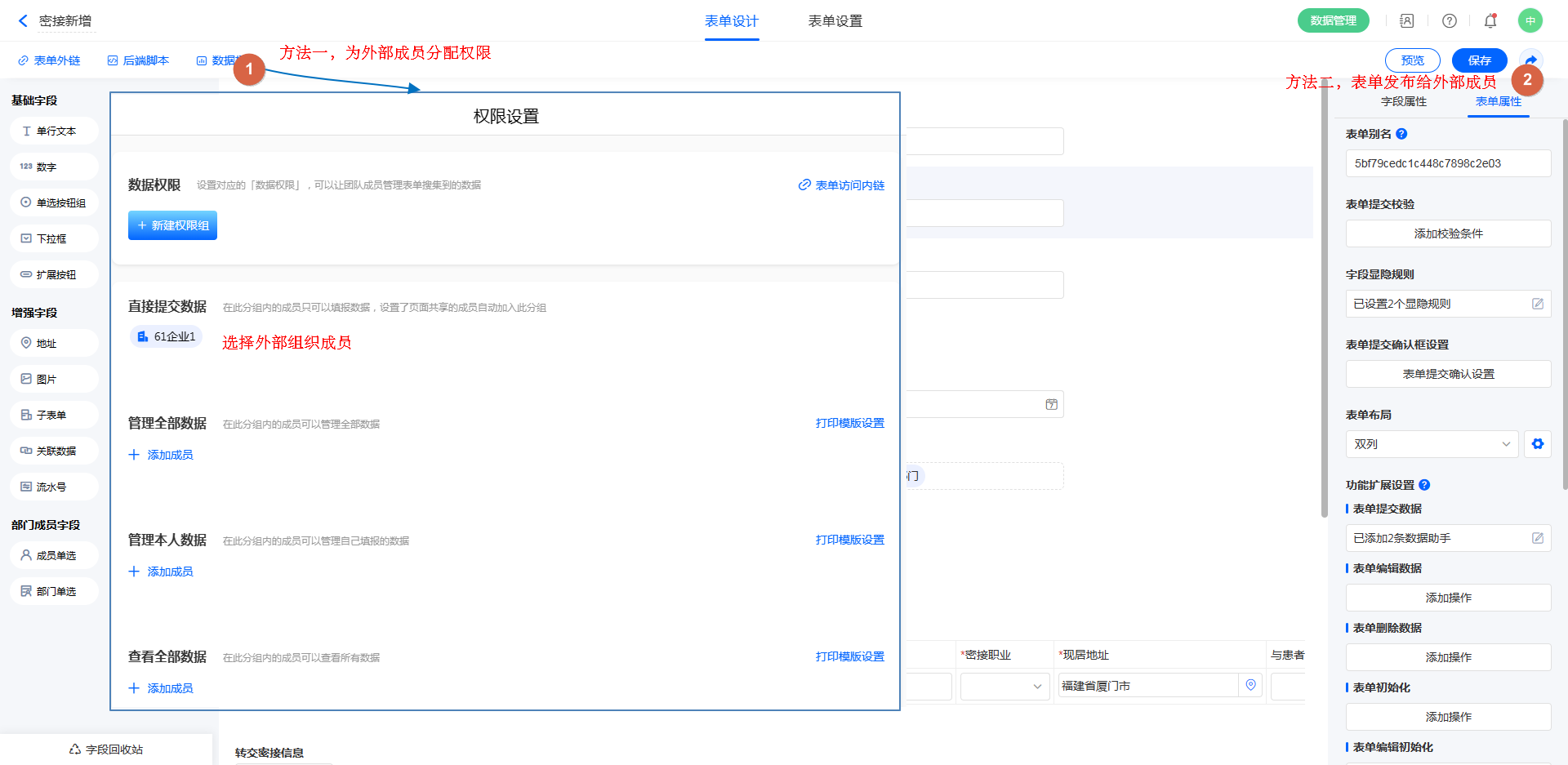 也可以在表单设计页面,发布给互联组织的成员或部门。