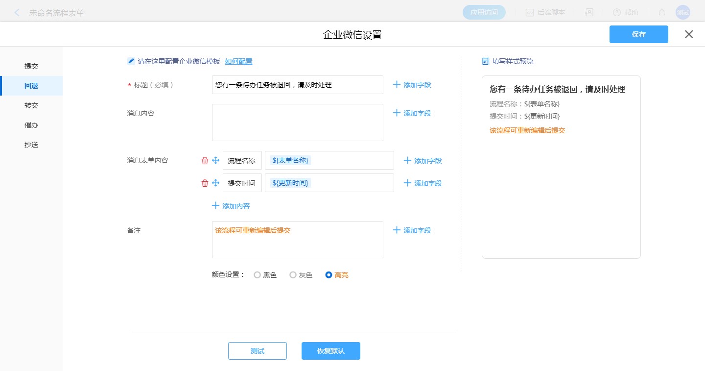 - 流程表单的提交、回退、转交、催办、抄送五种场景类型的消息模板,支持分别设计。