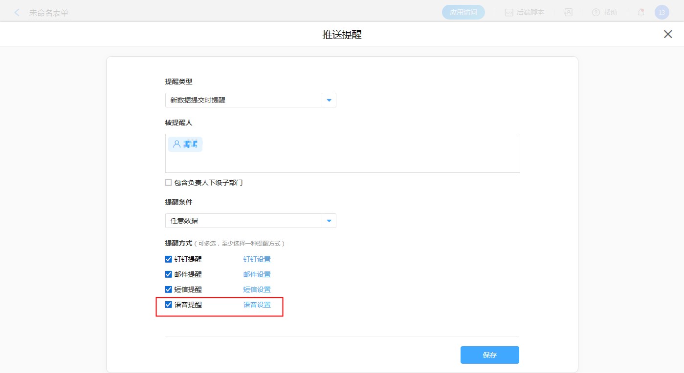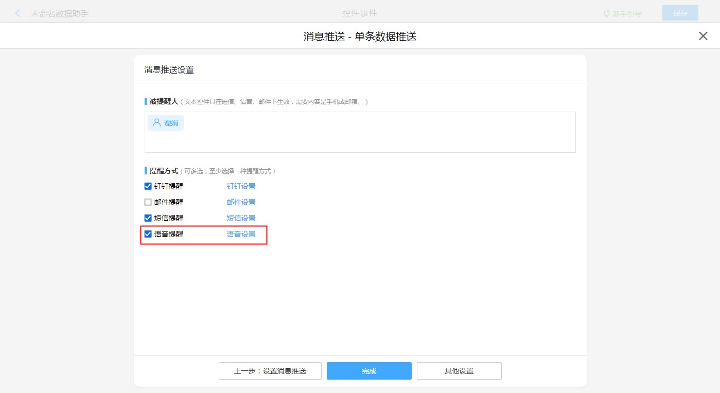 【普通表单设计】-【表单设置】-【消息推送】-【新建消息推送】-【语音提醒,语音设置】