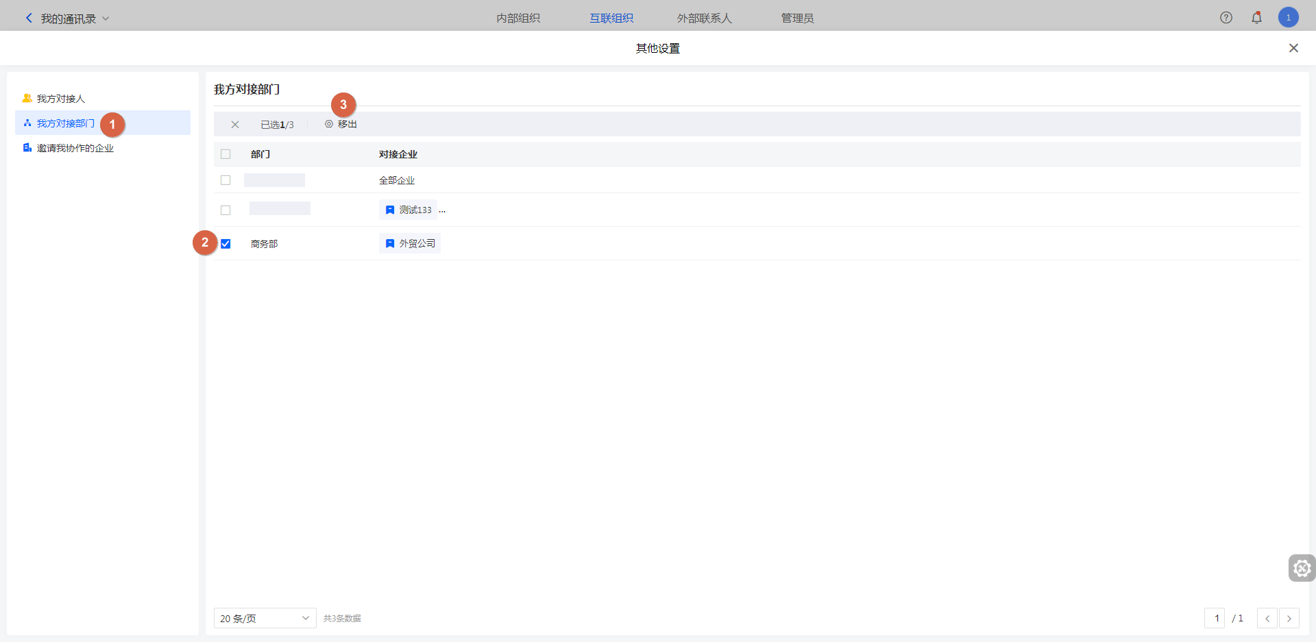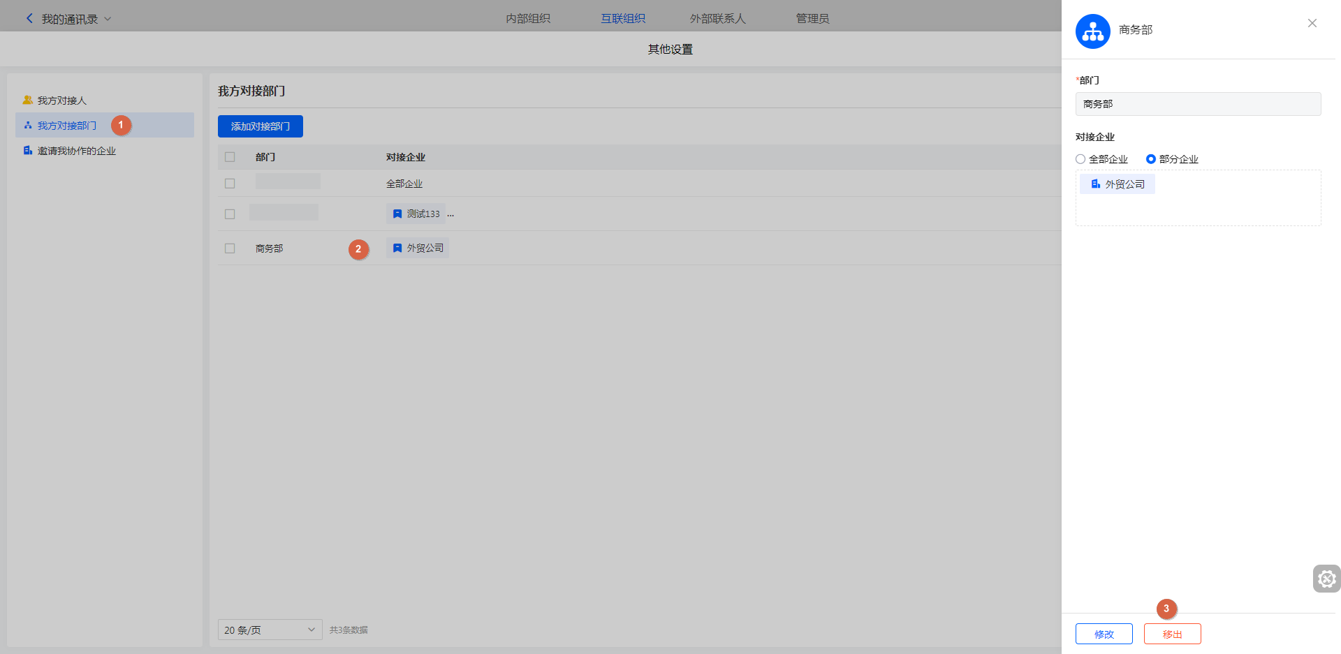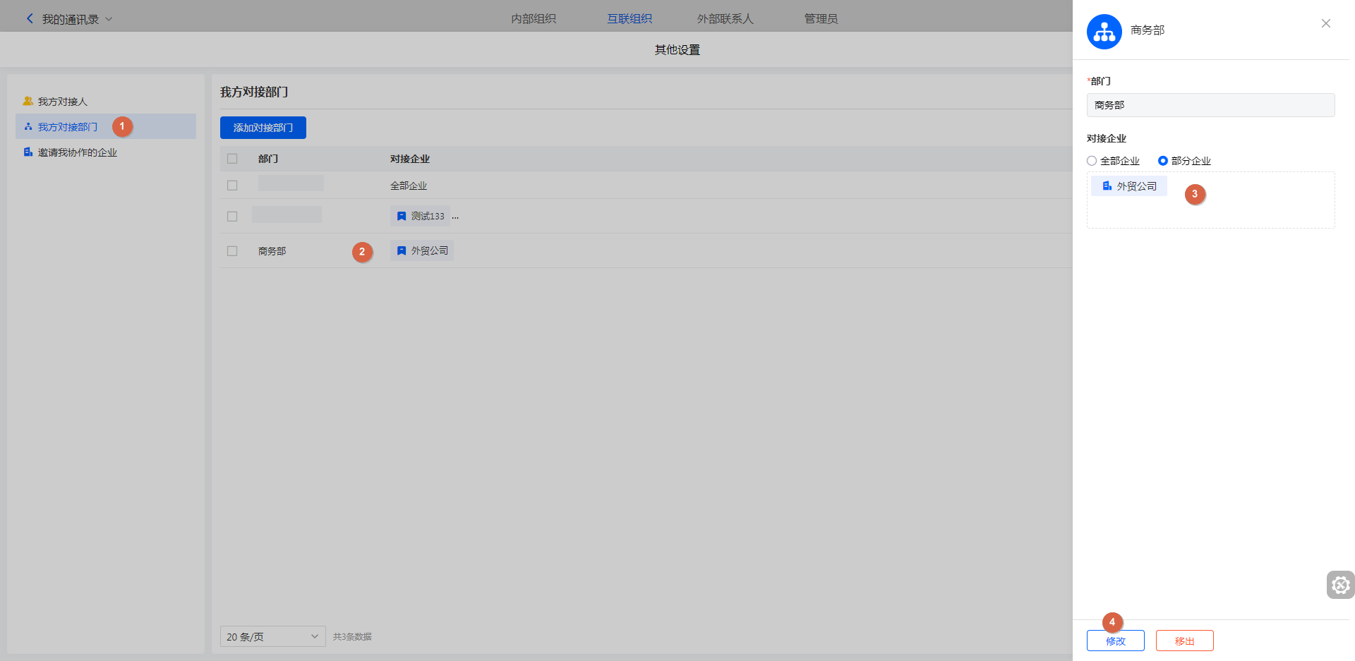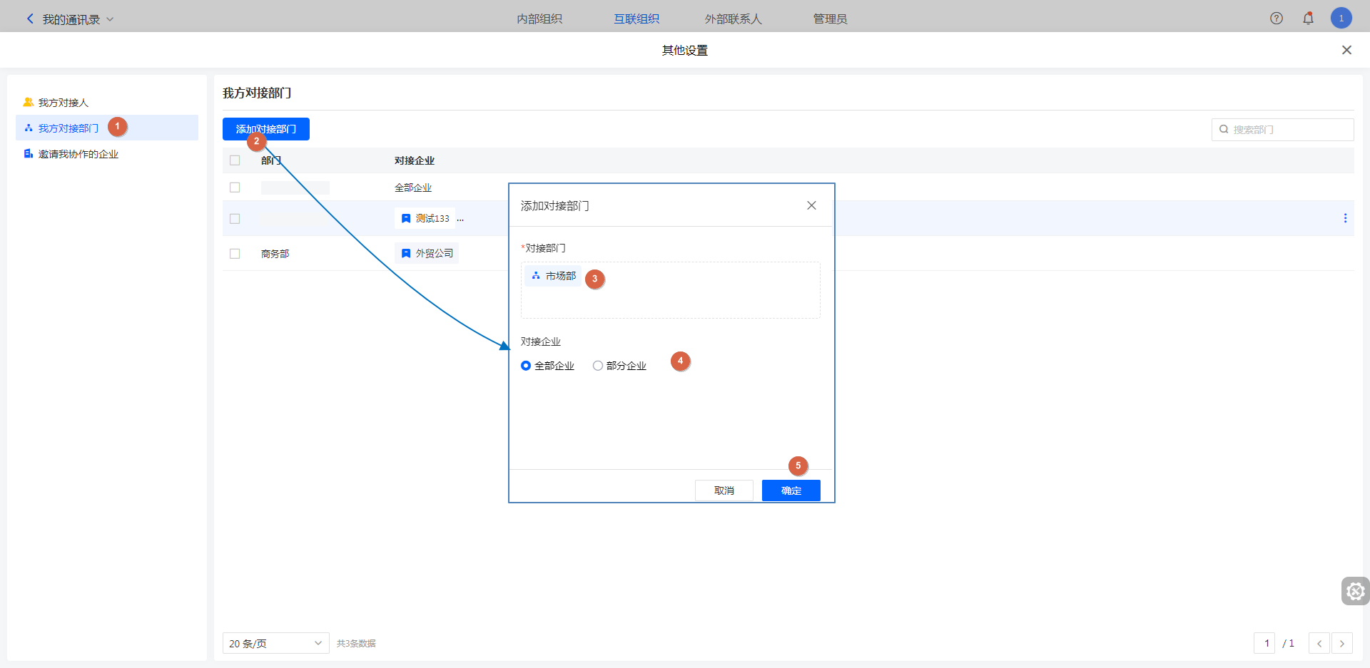 注意:只有内部成员部门可以设置为对接部门,外部联系人分组不可设置为对接部门;即外部联系人不参与企业互联的任何业务。