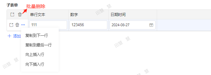| 可插入记录 | 可以在子表单中任意一行插入记录填写数据;勾选后,还也可以复制记录到下一行;勾选可插入权限必须勾选可新增记录权限 |
