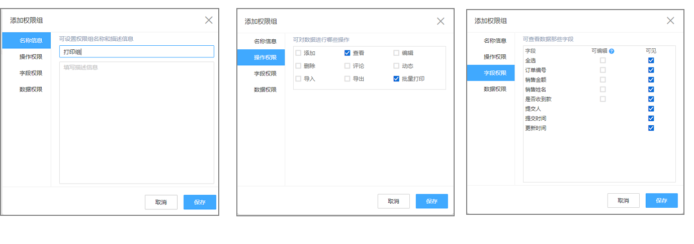 注意:权限组名称、操作权限、字段权限等设置完成后,还需设置打印模板(选择自定义打印模板)。