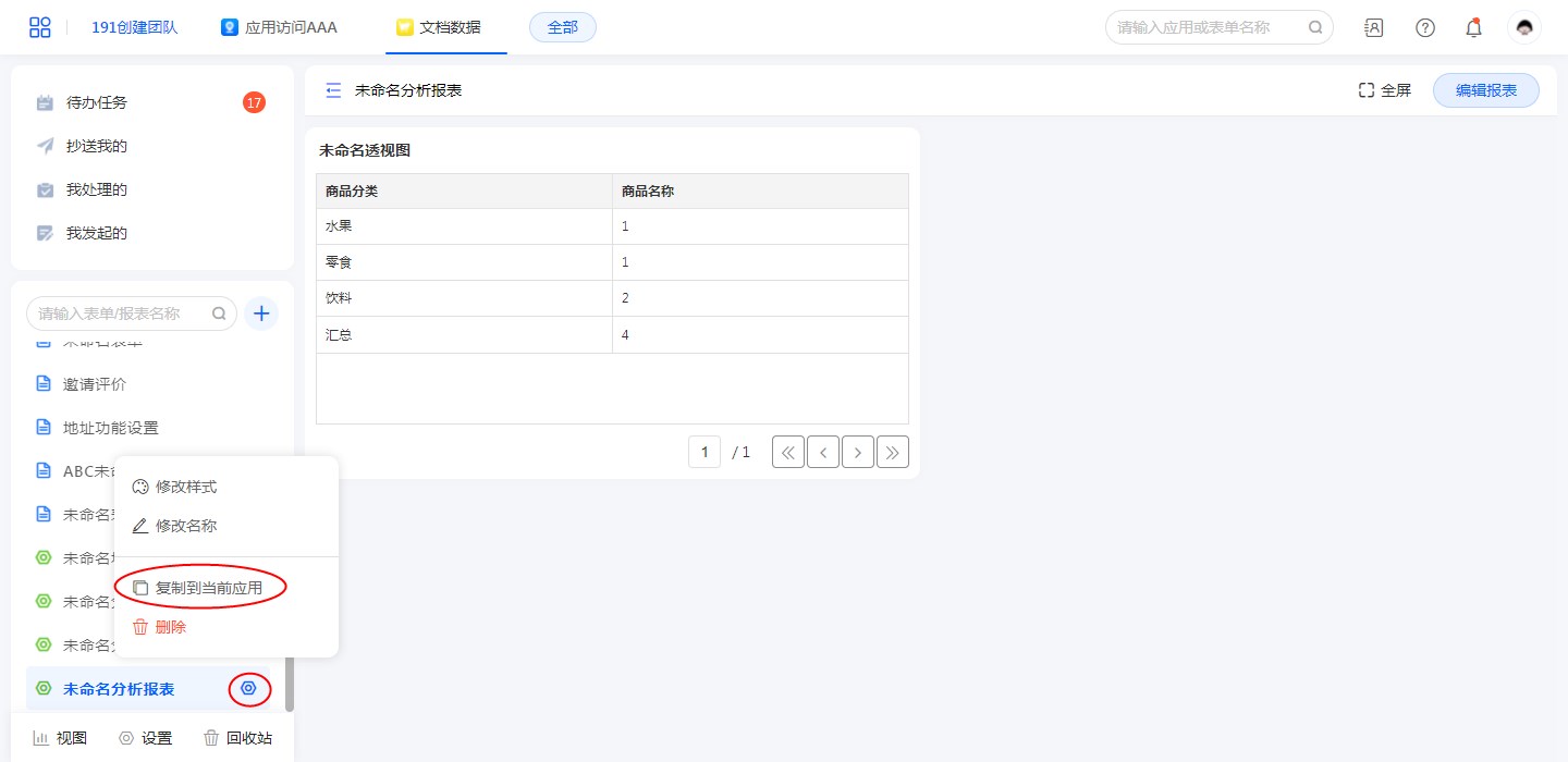 【管理应用】-【表单/报表列表下选择报表】,点击报表右侧的设置图标下的【复制到当前应用】,在当前报表下方变新增一个报表,内容与当前报表一致。