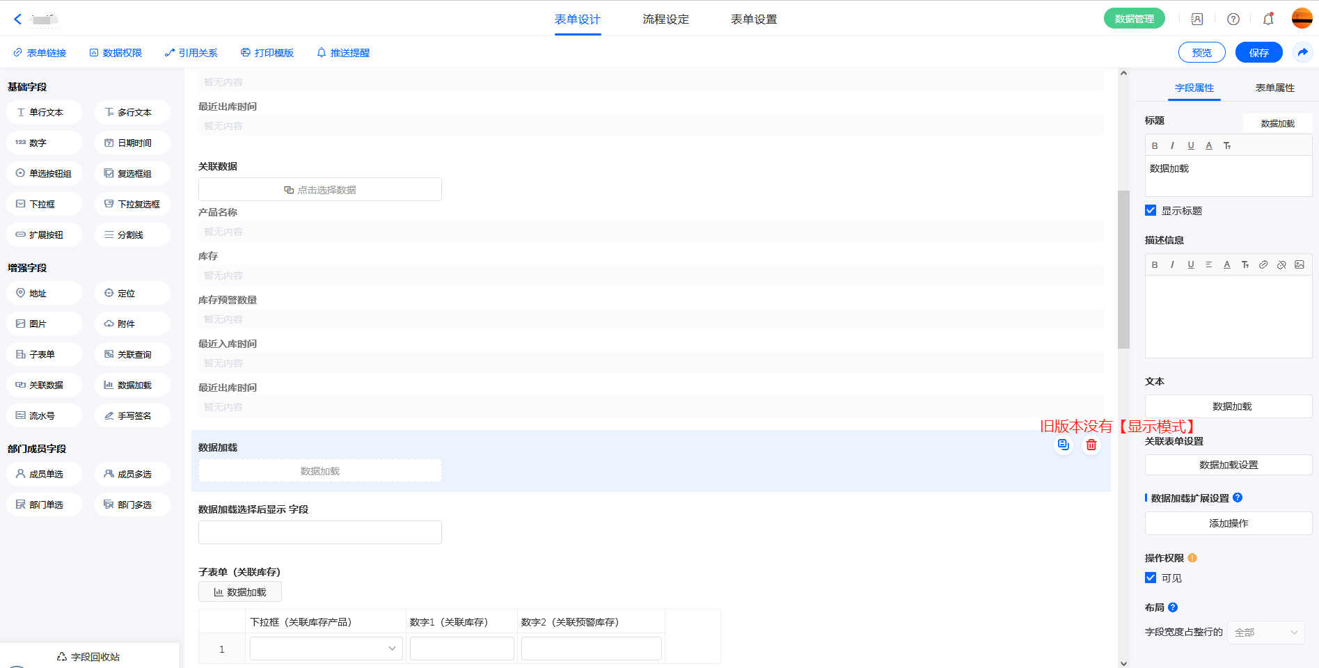 - 数据加载设置项 对应文本/数字字段,不支持选子表单