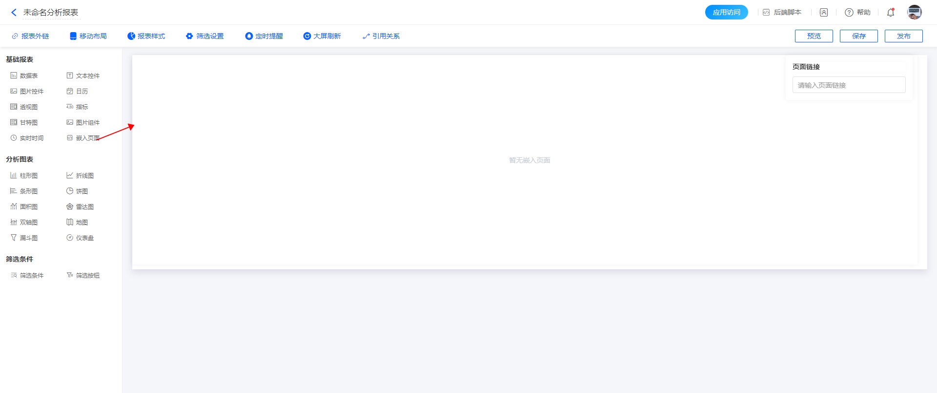 报表设计页面,拖动「嵌入页面」到报表中,如图: