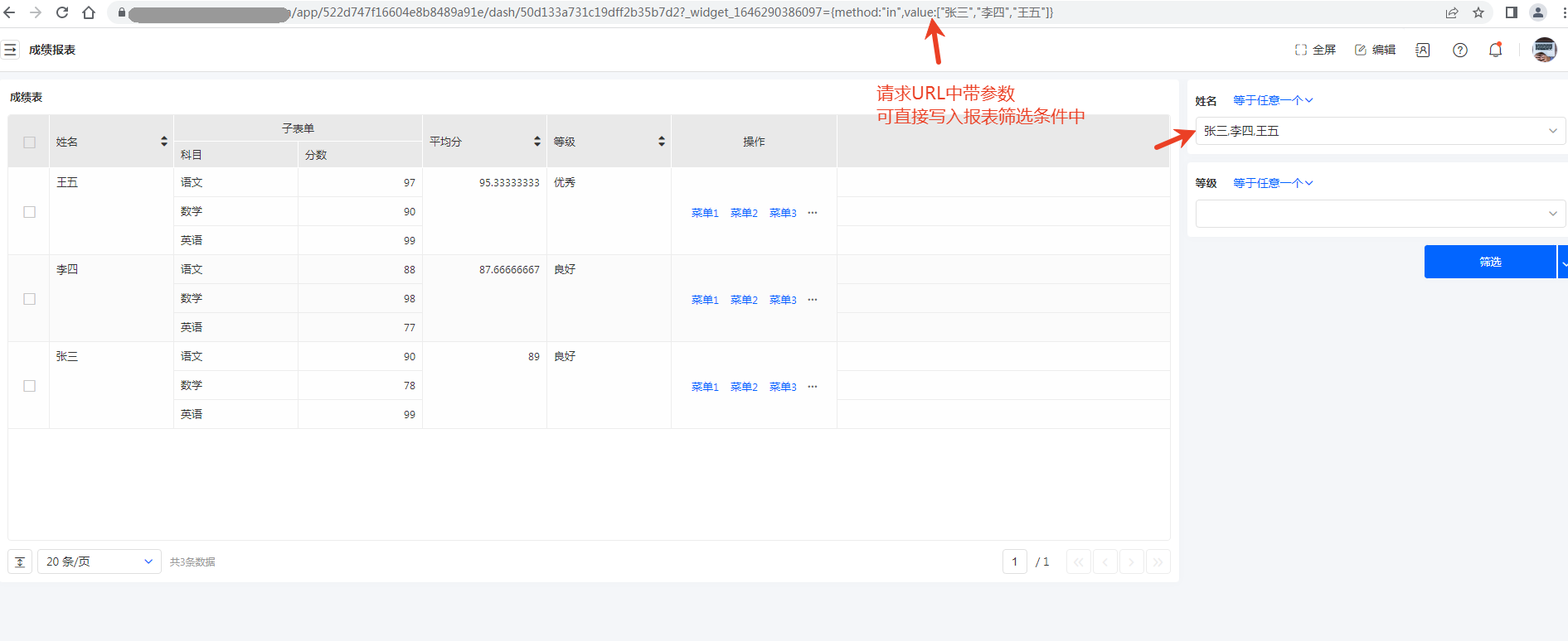• 卡片报表常规访问:https://abc.net/team/app/5a64953530d237ecafa7c0bc/scenes/5e3c0c0138bc43c99213f7ee?widget_1766112065326={method:"range",value:[1,100]}&_widget_1766112065322={method:"in",value:["张三","李四","王五"]}