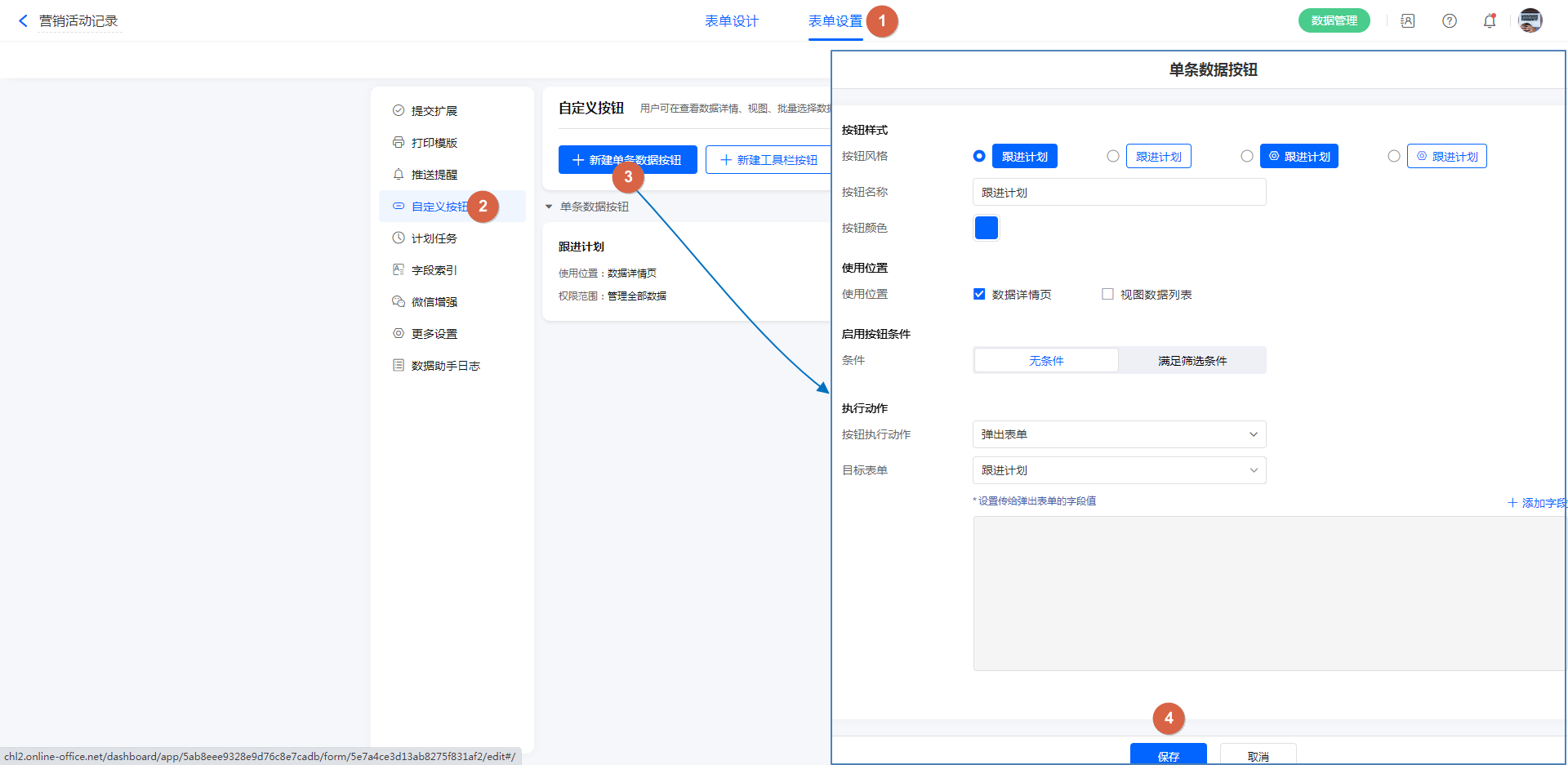 表单设置->自定义按钮->新建单条数据按钮。