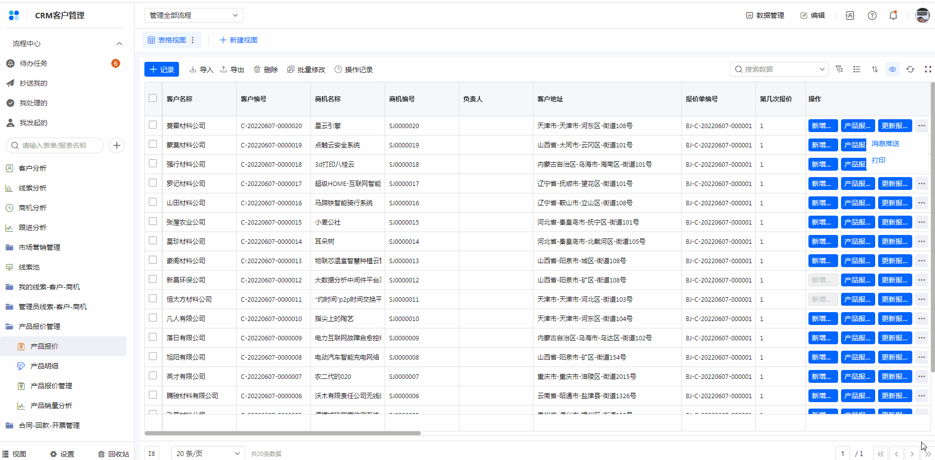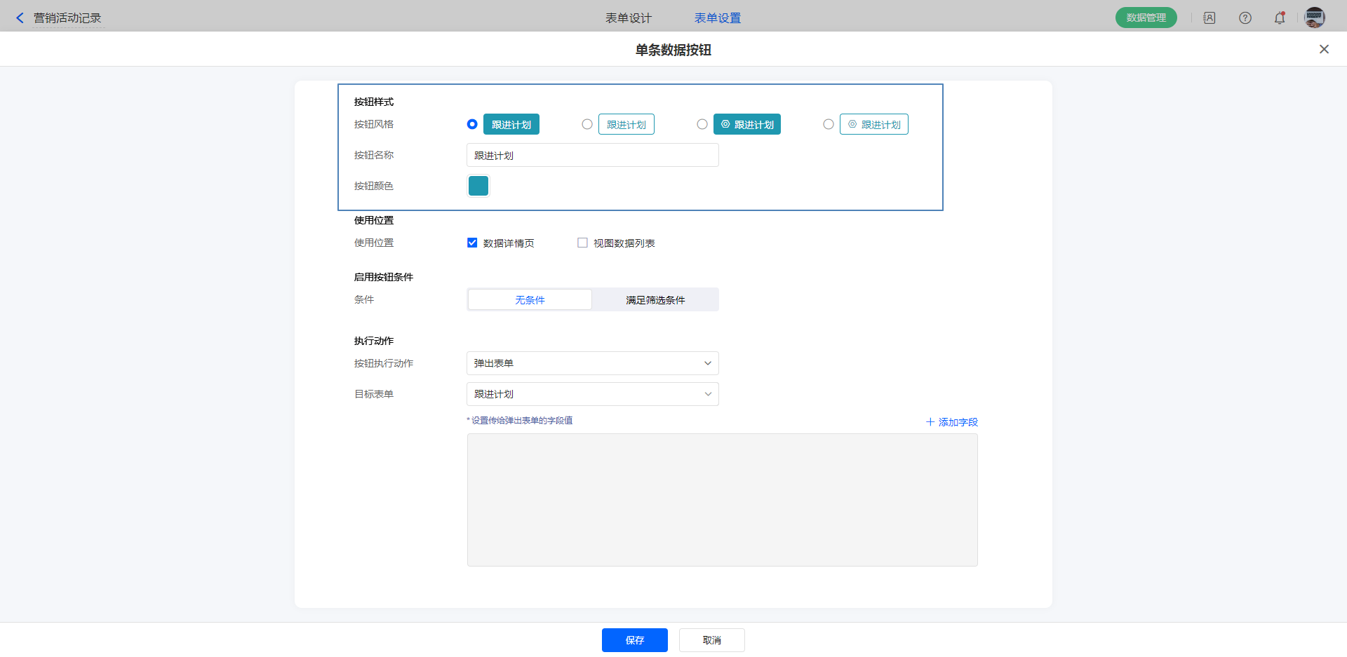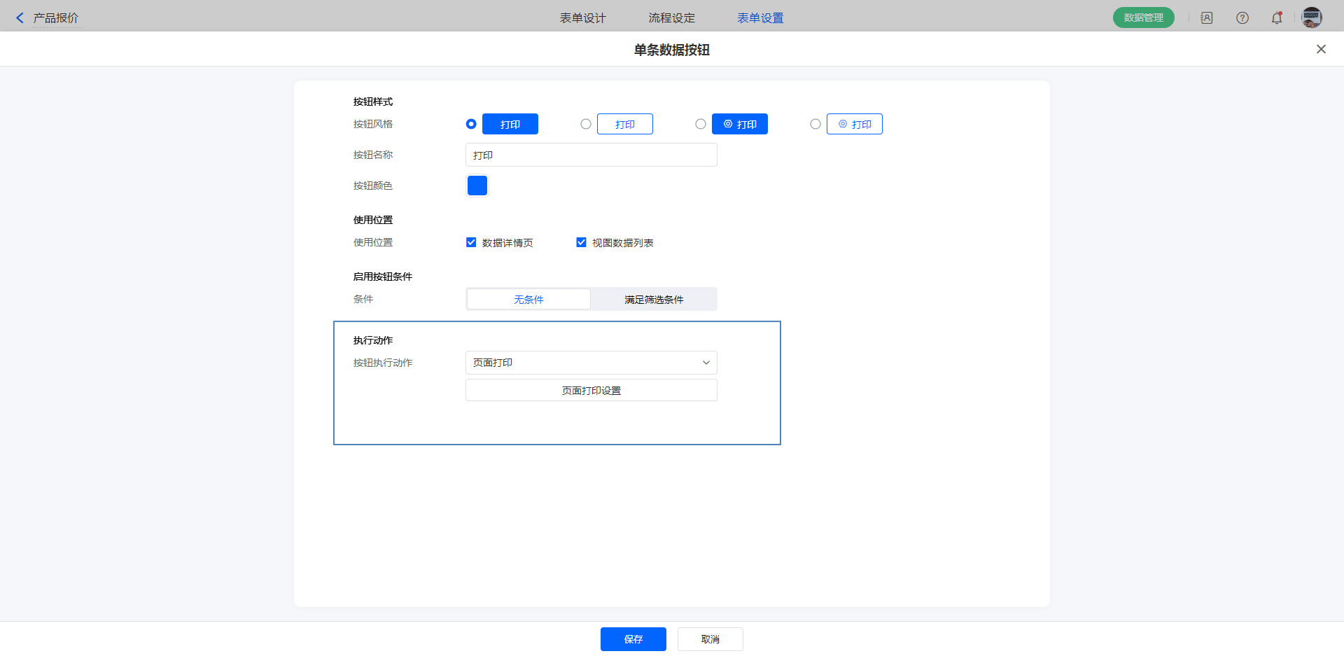 单条数据按钮,在表单浏览时,可针对单条数据做出对应的操作。