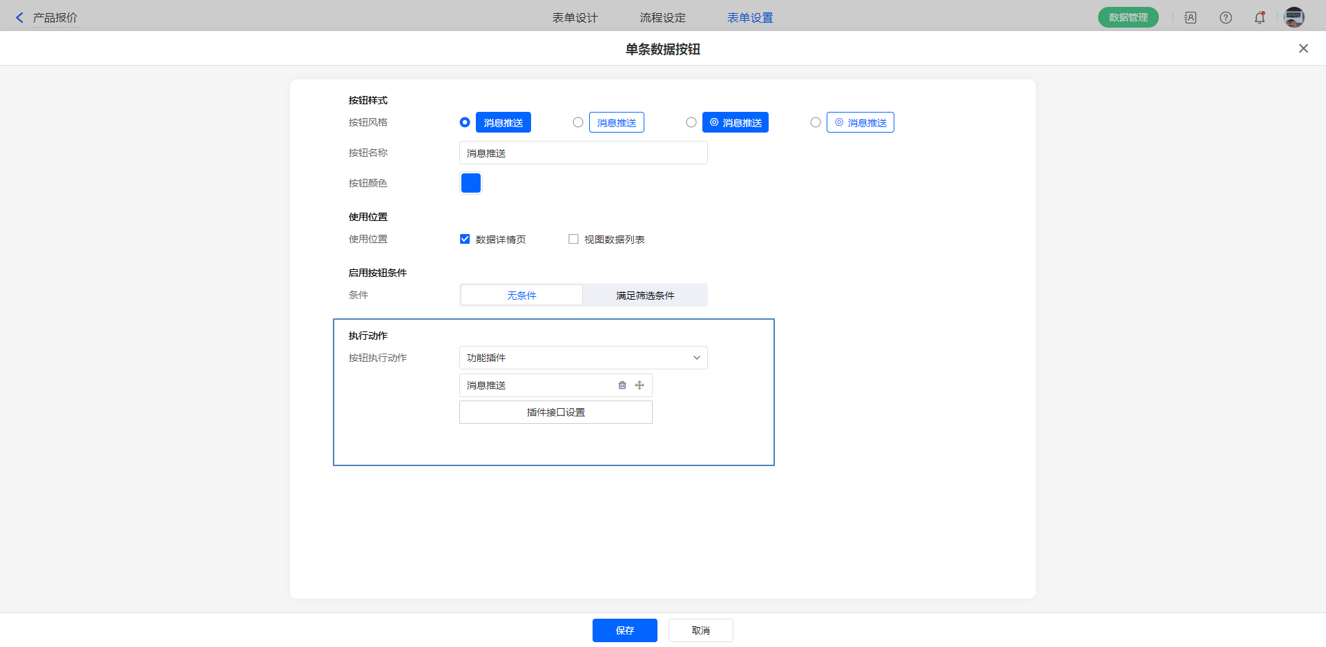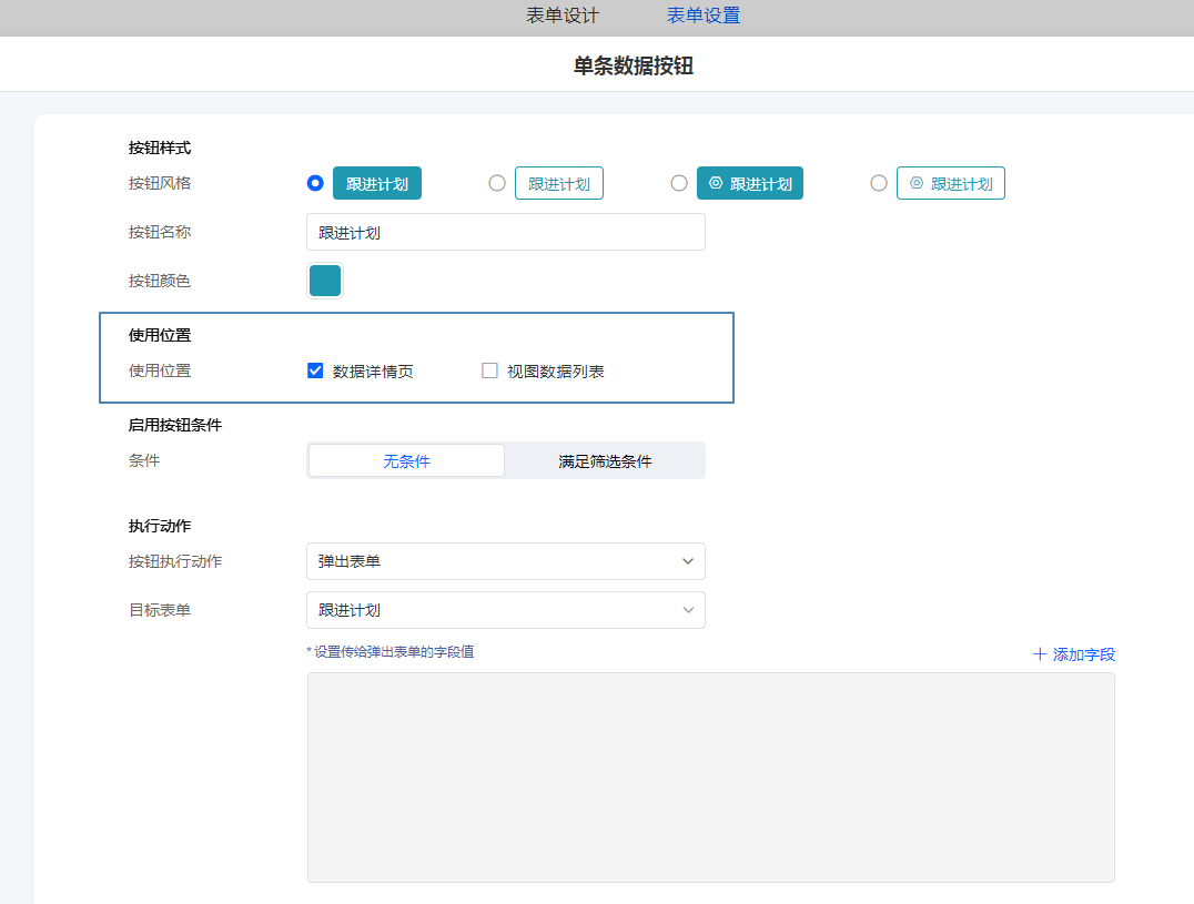 配置按钮的使用位置:数据详情页和视图数据列表。