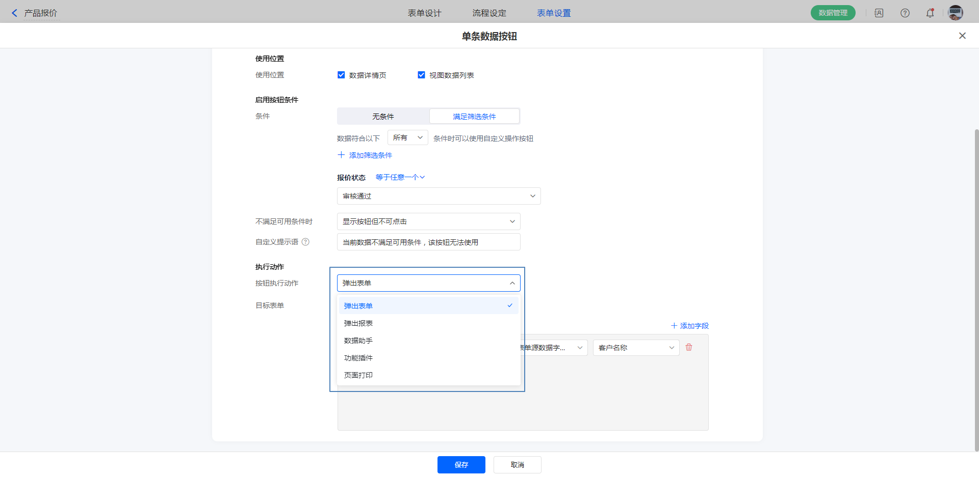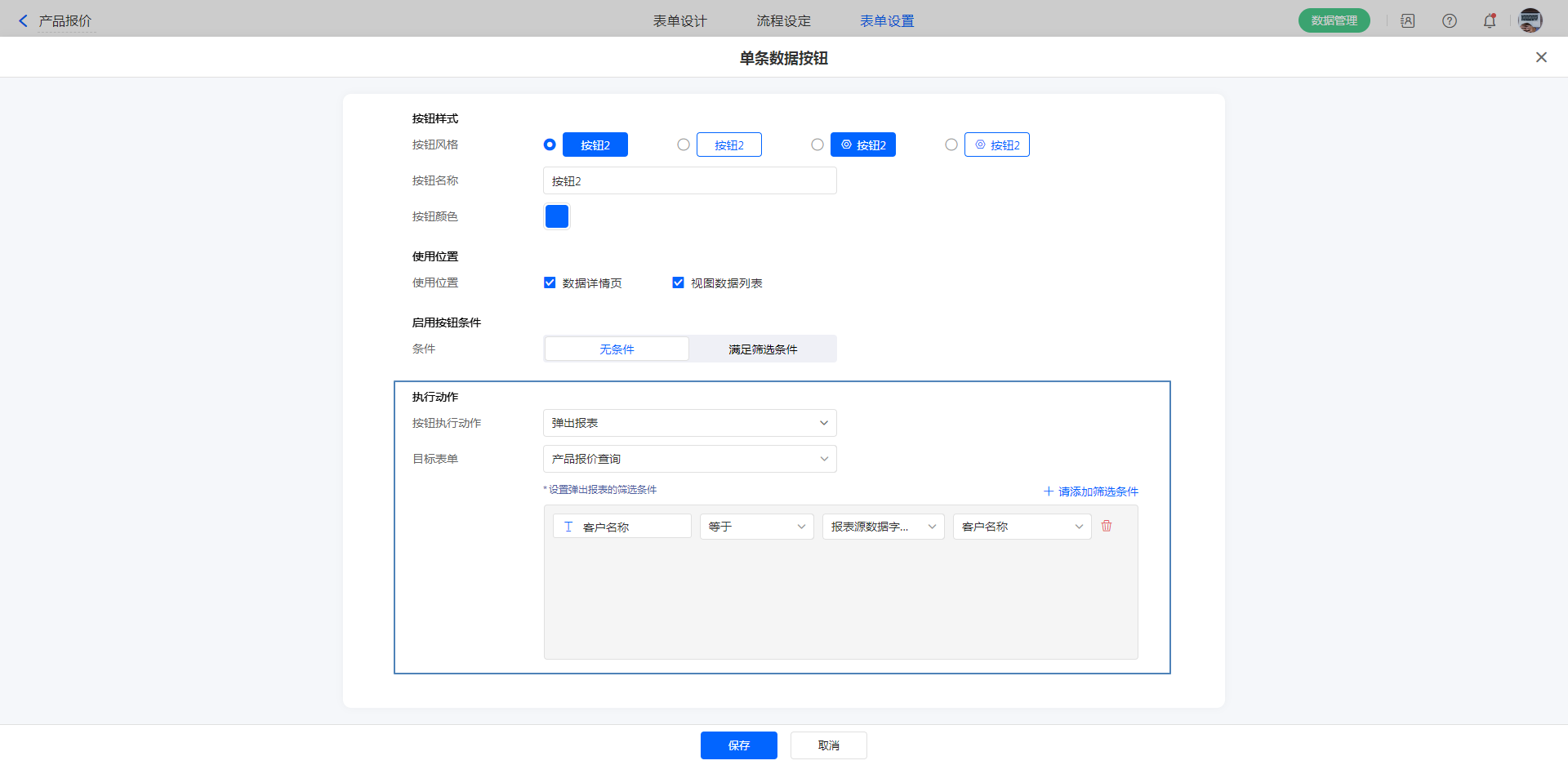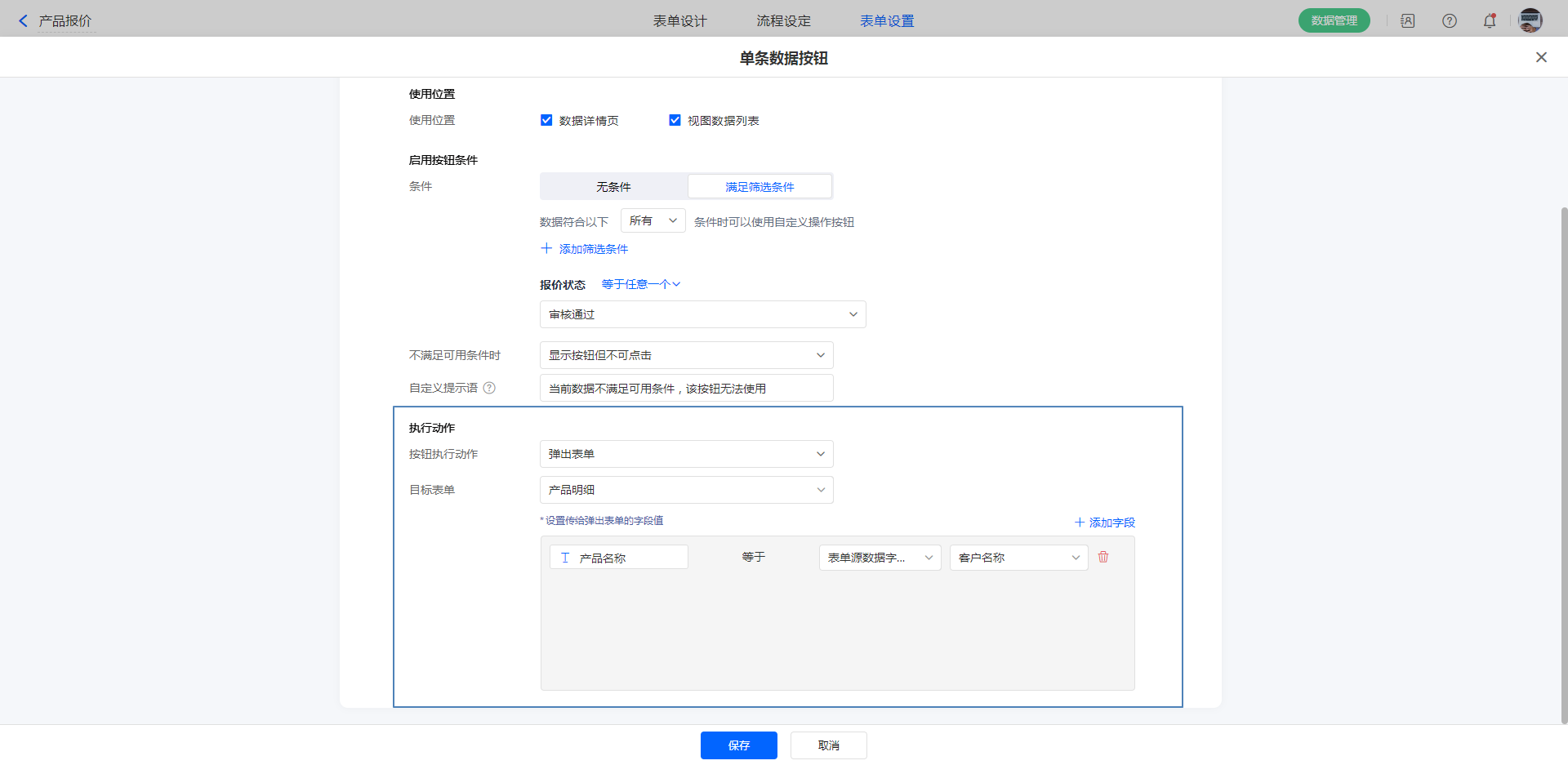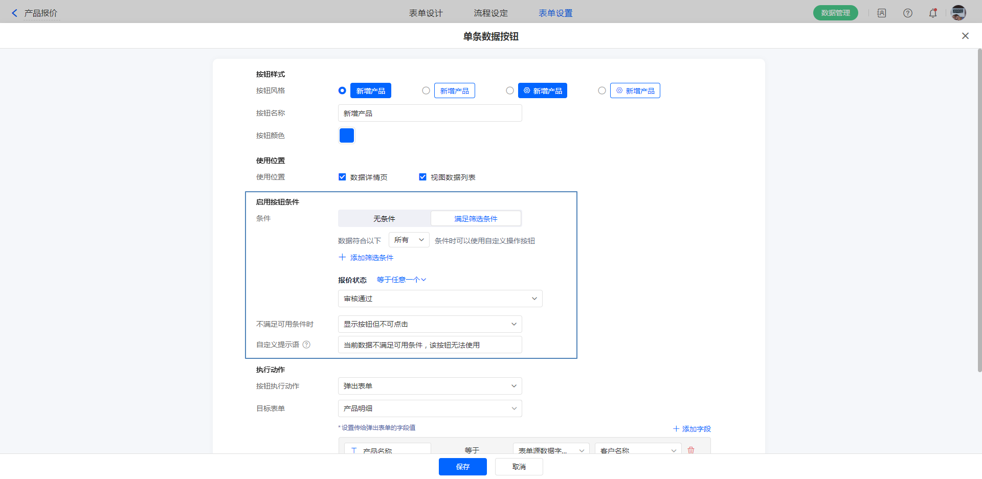 若设置了条件后,在当前查看的数据满足可用条件时,才可使用自定义按钮。