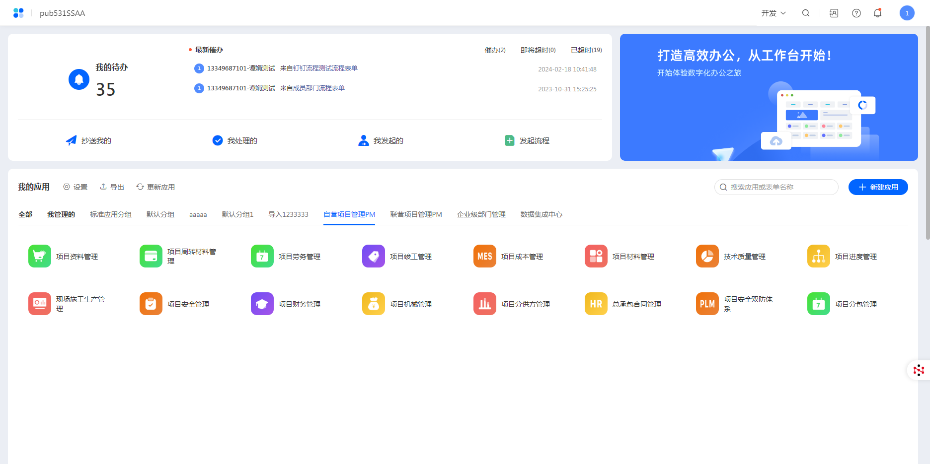 工作台可以配置顶栏应用、流程中心、快捷入口、常用应用、报表看板,让您可以更快速的处理各项事务。
