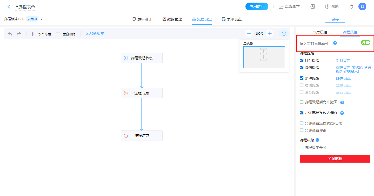 当有外部联系人参与流程流转或者需要接收表单消息时,可以勾选微信提醒方式,需要注意的是,钉钉团队模式下,微信消息只能发送给外部联系人,内部成员就算绑定了微信也不会收到微信消息。