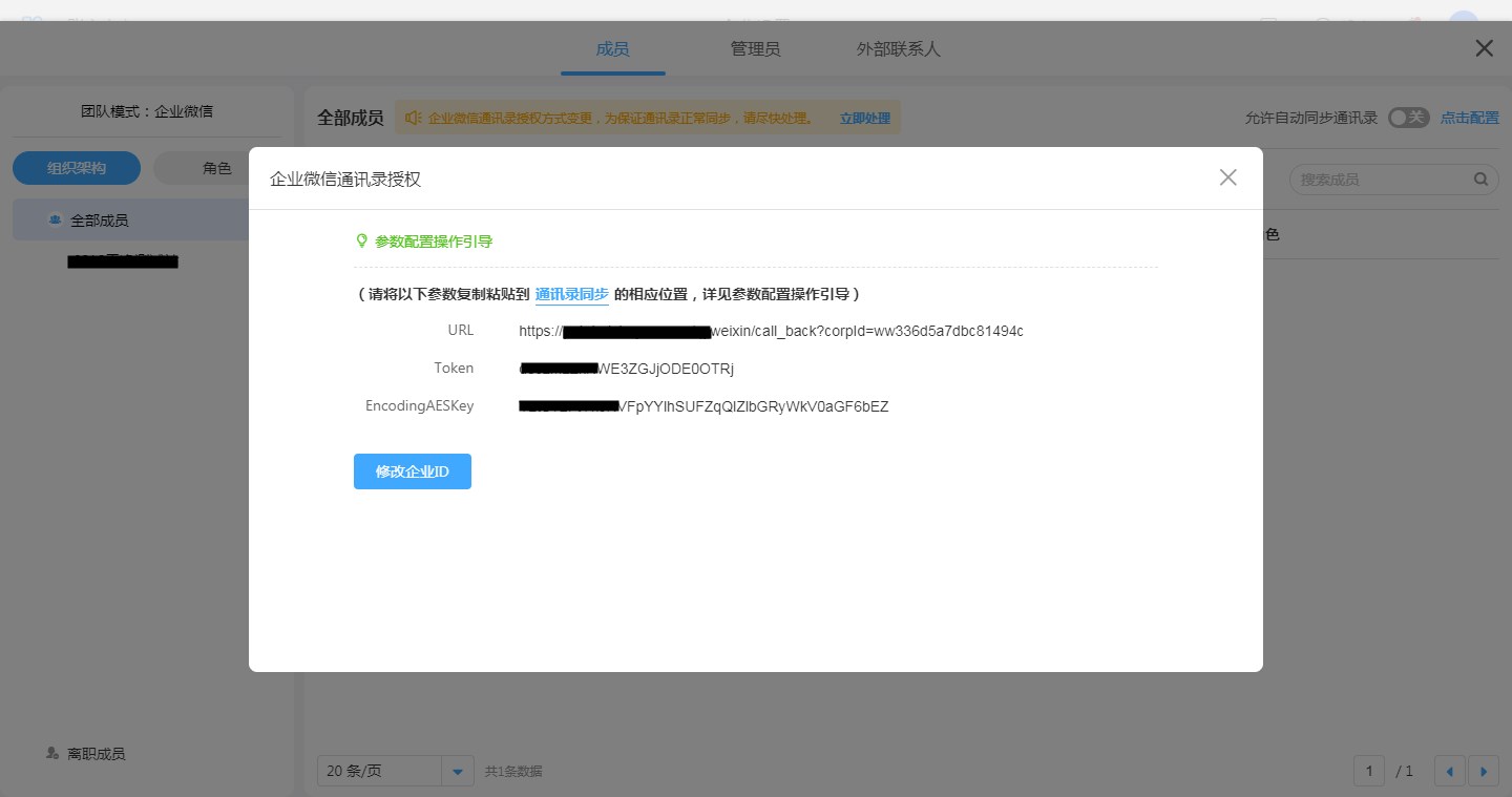首次开启【允许自动同步通讯录】时,会弹出企业微信通讯录授权弹窗(关掉弹窗后,也可以点击【点击配置】弹出参数弹窗),根据页面引导将参数写入企业微信对应属性中。