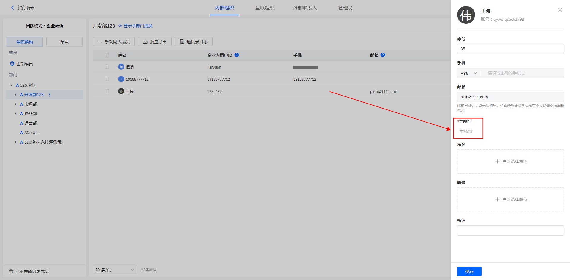 - 在企业微信通讯录修改主部门信息后,需手动同步才会同步。