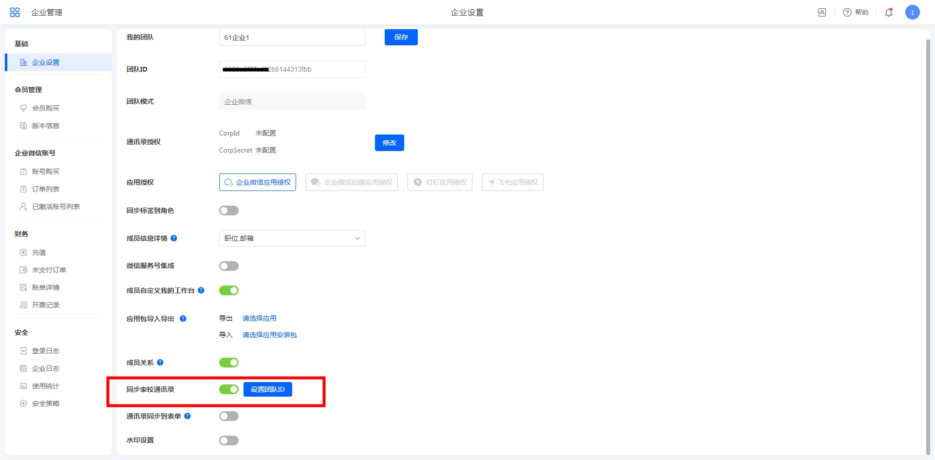 企业微信自建应用授权模式:创建者登录,进入系统[账户中心]->[企业设置]->[同步家校通讯录],根据页面指引完成配置,并开启家校通讯录同步开关。