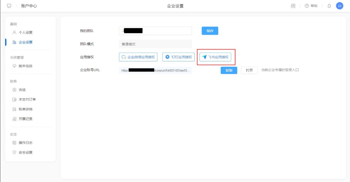 工知云账号登录系统后,进入【右侧头像】-【账号中心】-【企业设置】,在企业设置中可以进行飞书应用授权。