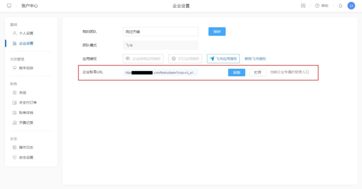 成员打开企业URL(账户中心-企业设置-企业URL),使用飞书扫码登录。