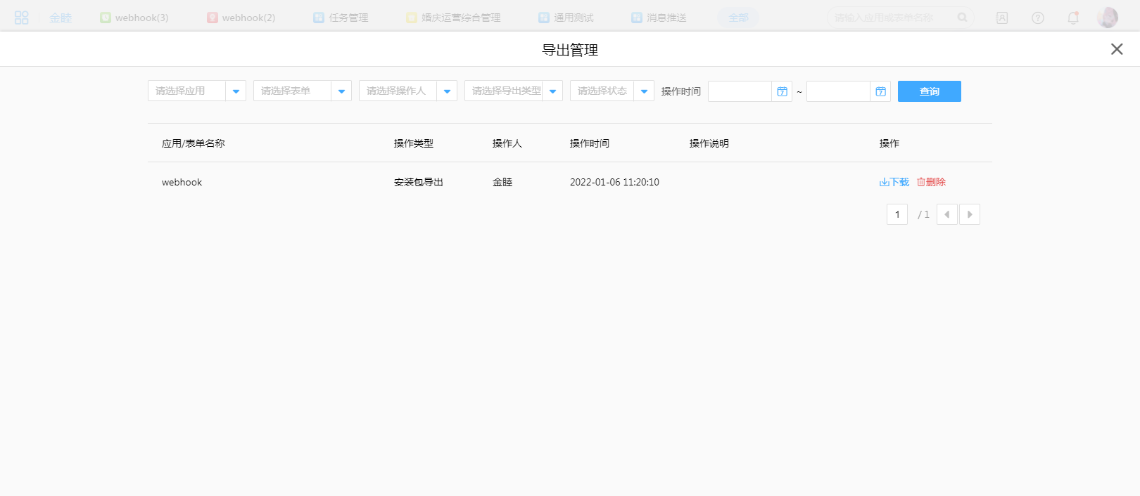安装包导出后需在【工作台】——【点击右侧头像】——【导出管理】查看导出记录或下载安装包。