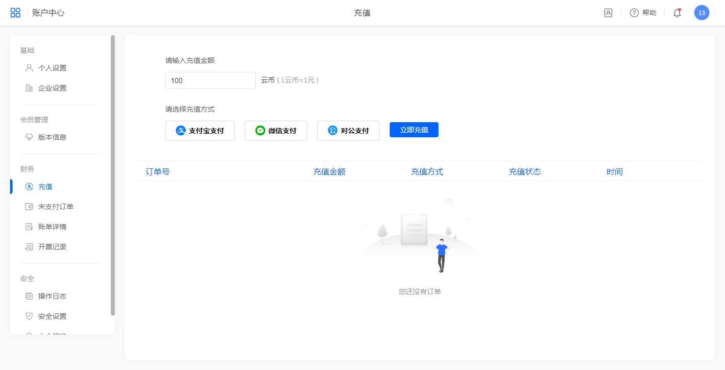 支持:支付宝、微信、对公支付三种充值方式。