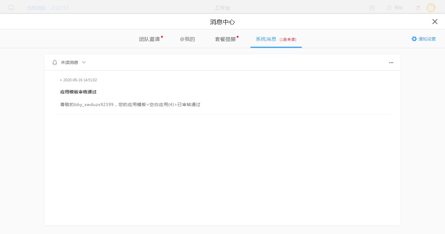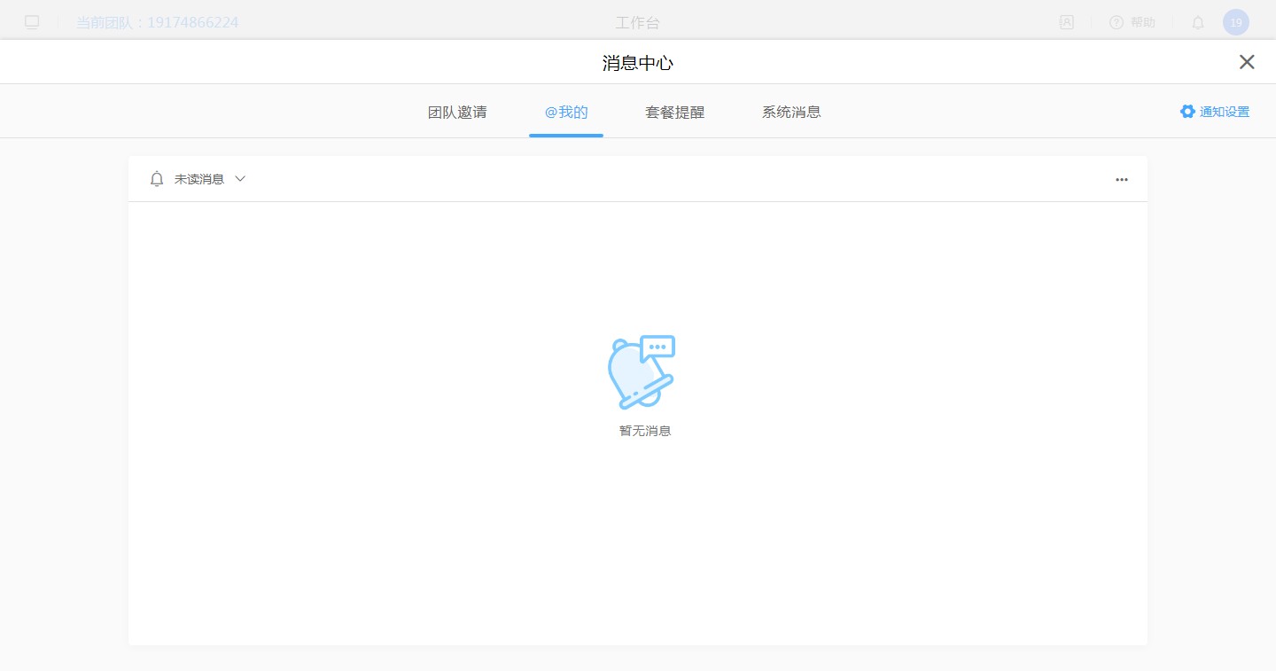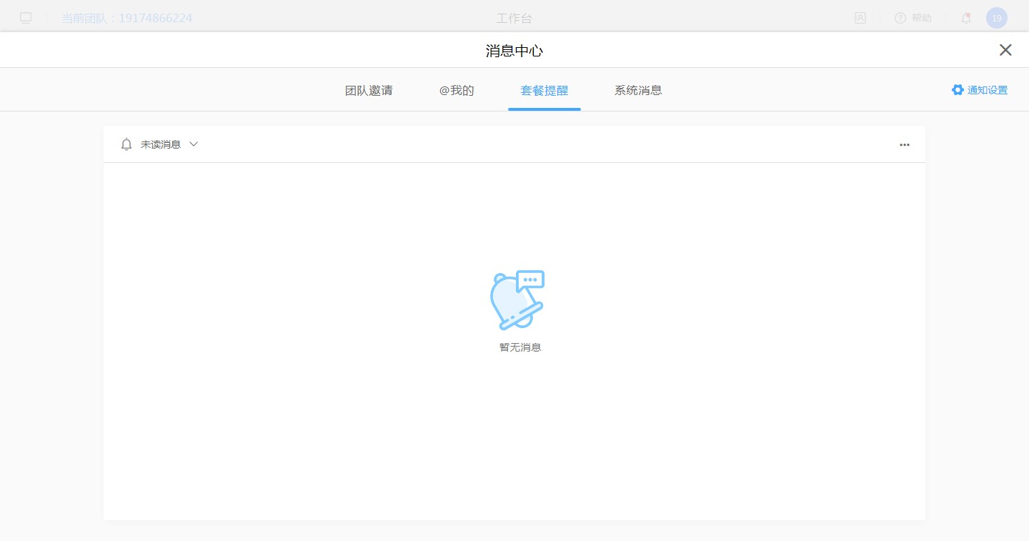 现在消息管理中的消息包括【系统消息】、【套餐提醒】、【团队邀请】、【@我的】这4种类型,不同的消息类型对应的不同的通知信息。