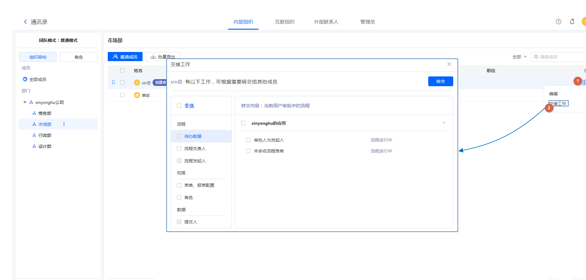 对于即将离职的成员或者已经离职的成员,可以查看其手中的工作并交接给其他负责人,包括流程、权限、数据等工作类型。