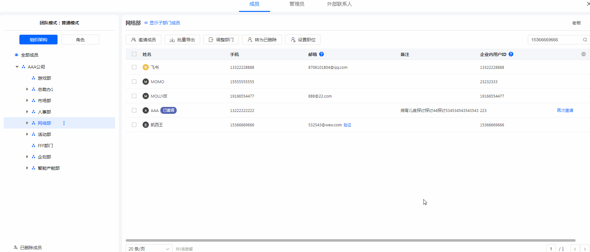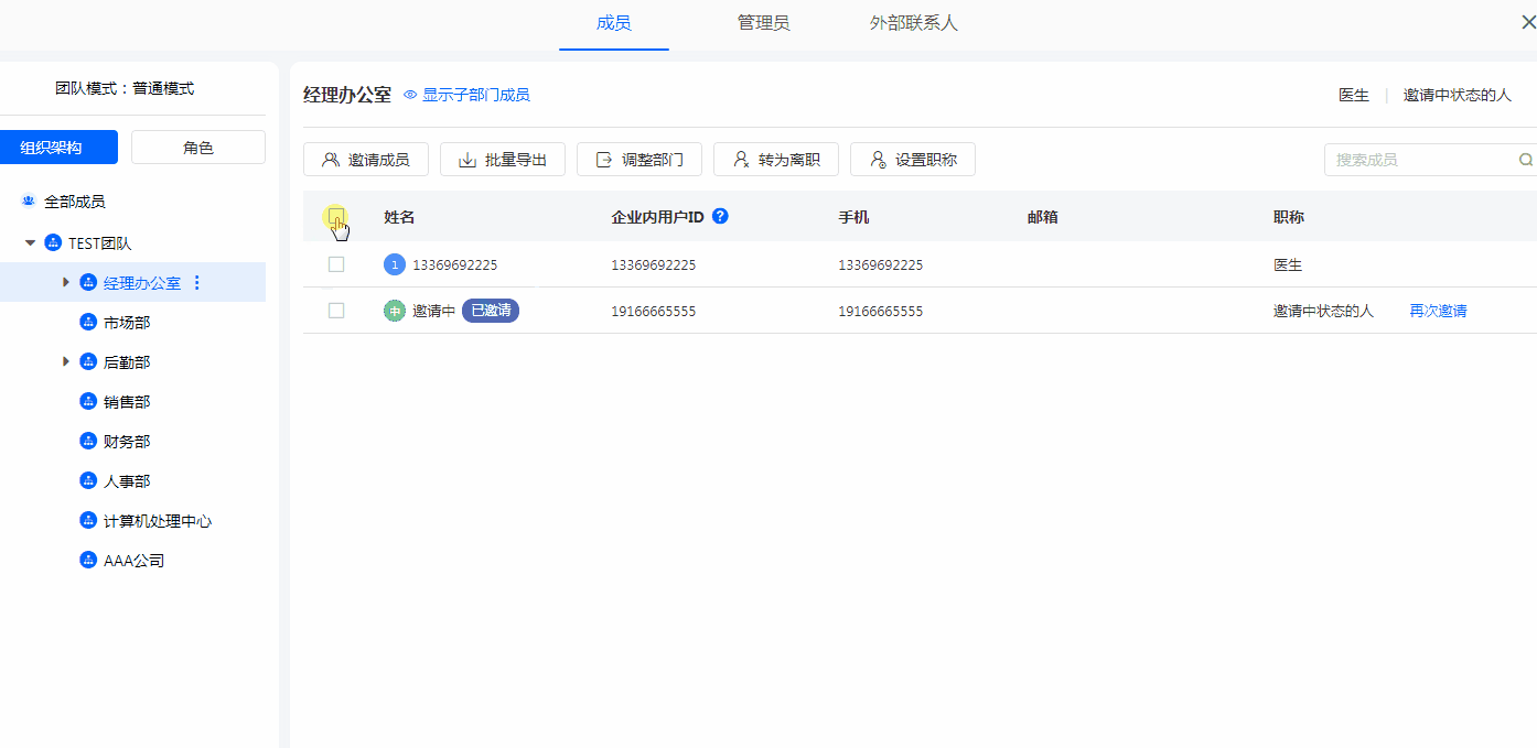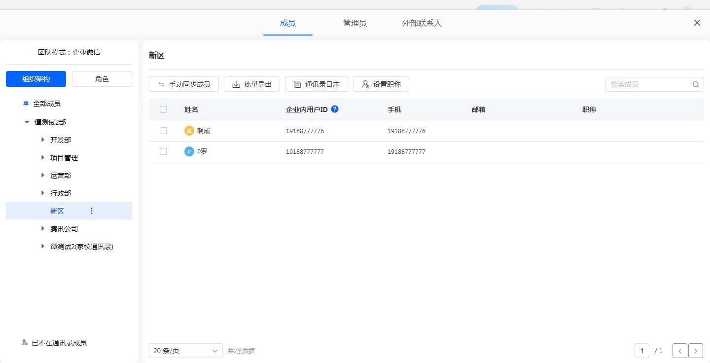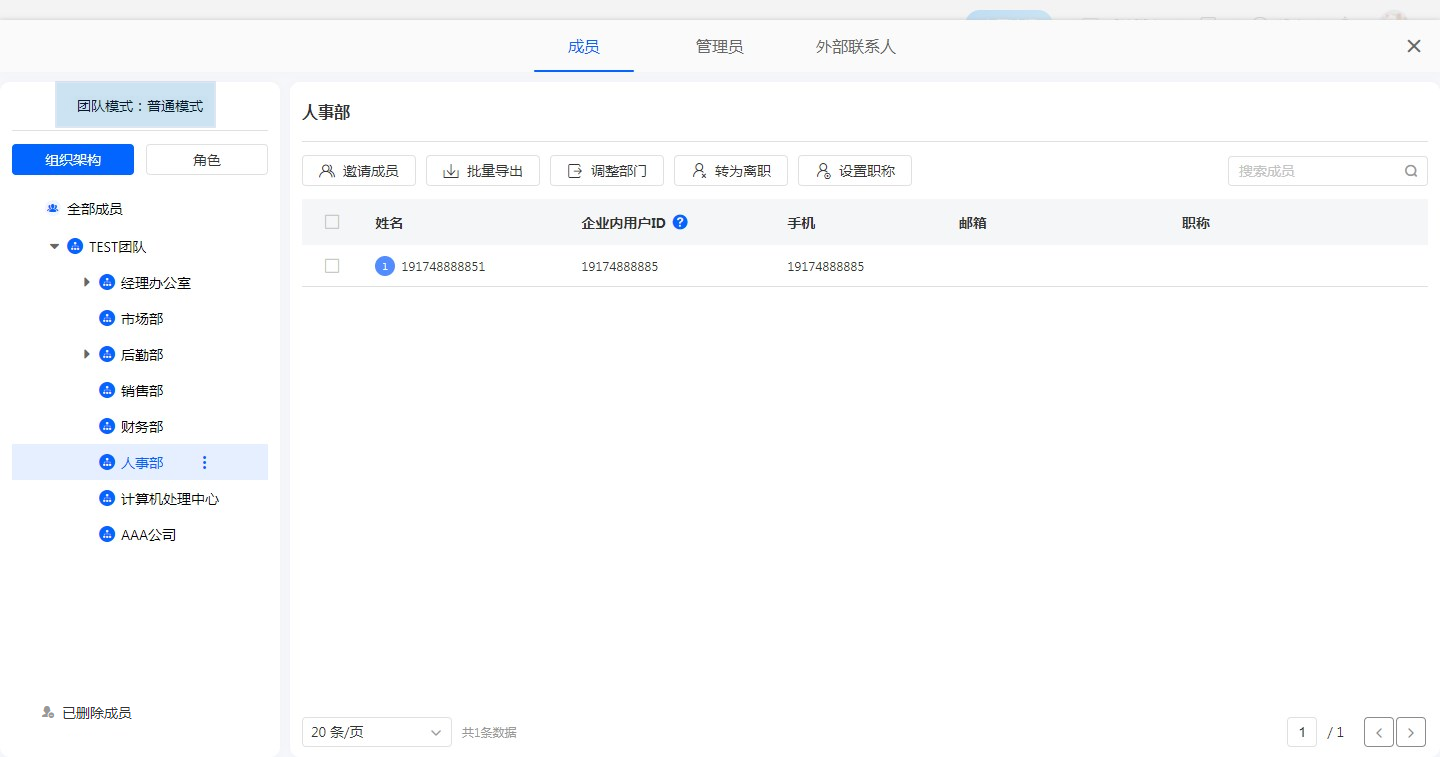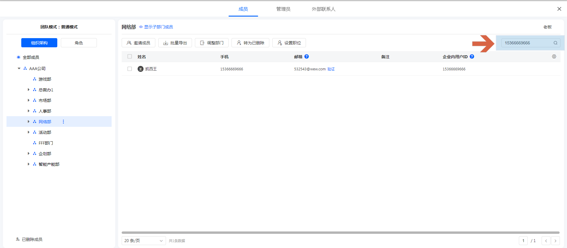 支持按姓名、手机、邮箱、职位进行模糊搜索,搜索范围为当前所选部门。