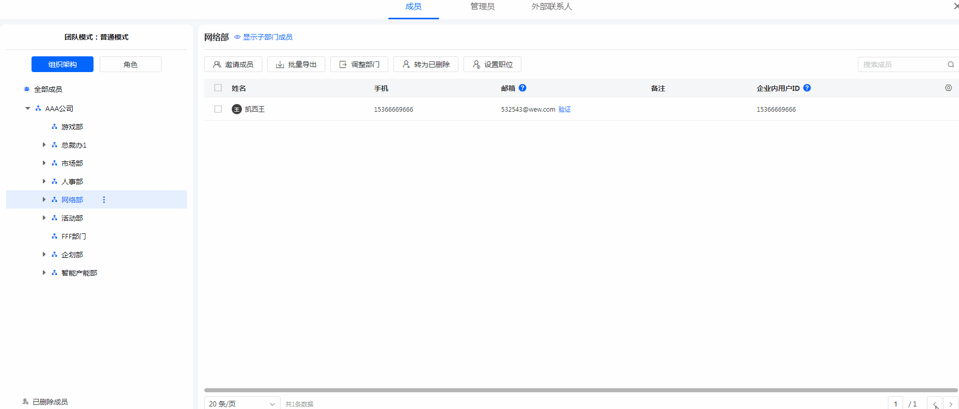 通讯录页面点击单条成员数据可以查看详情并进行姓名/企业ID/手机/邮箱/部门/角色/职位等信息的修改。