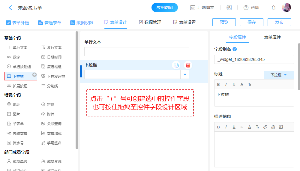 “字段别名”用于后端开发,默认为系统自动生成的随机字符串,可修改。