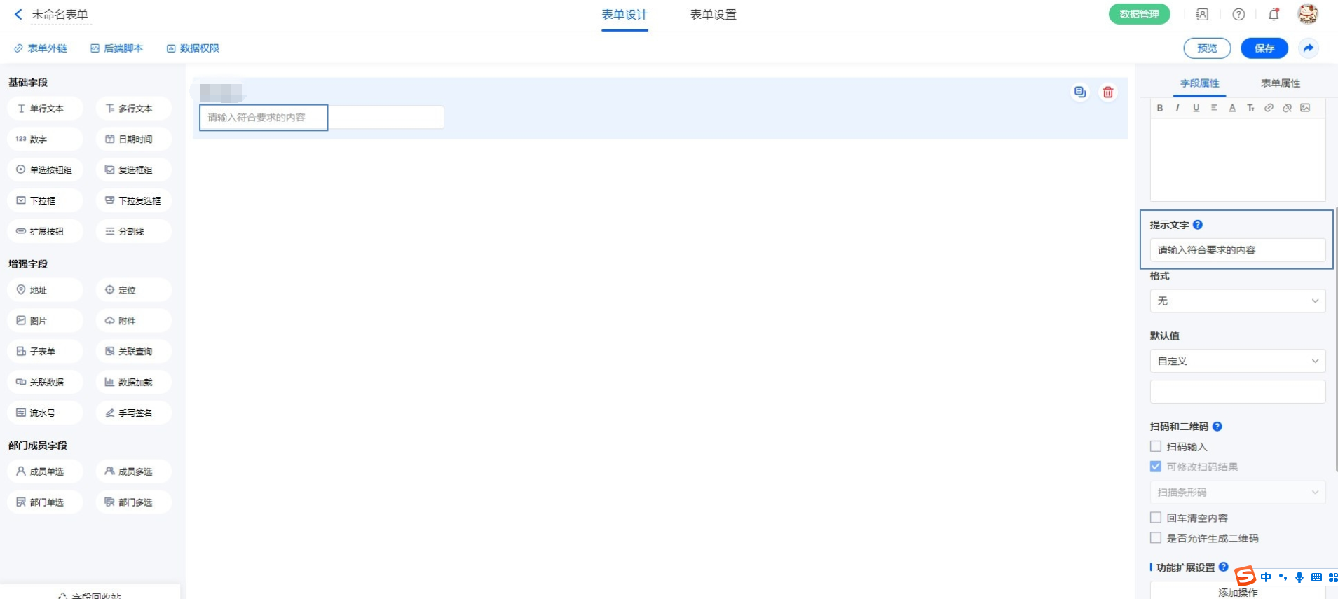 | 9、二维码图片 | 输入字符串后,自动转化为二维码展示在输入框下方。 子表单中,单行文本字段不支持此格式。 |