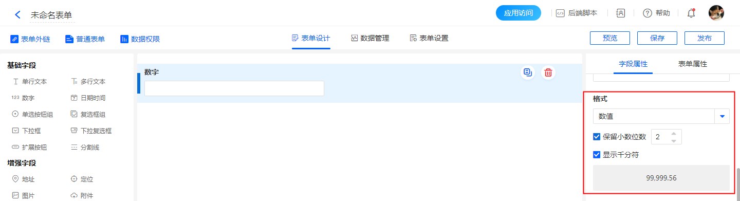“数字”是用于表单中数值记录或计算的场景,只允许输入数值类的值。