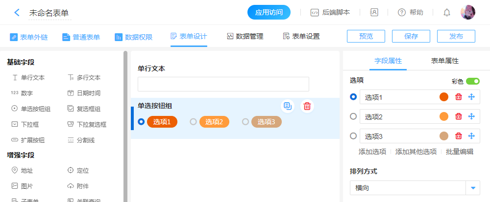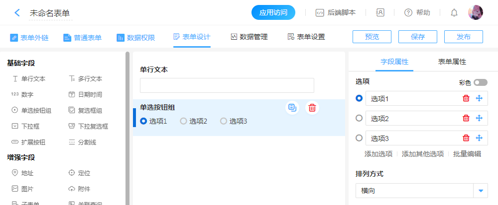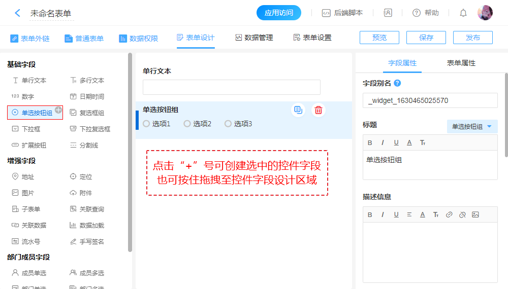 “单选按钮组”用于表单中单选的场景,在录入数据的时候直接选择选项。