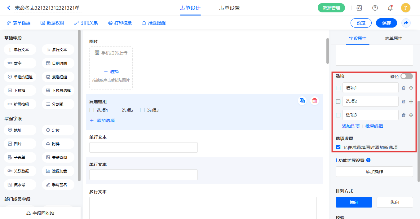 勾选允许成员填写时,添加新选项成员增加自定义选项