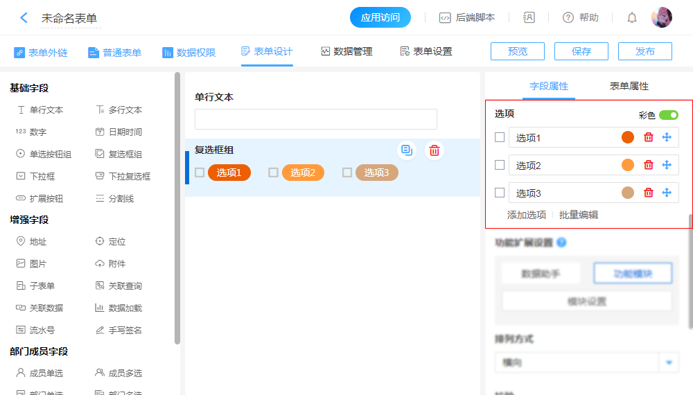 | 选项排序 | 选项右侧有排序按钮,点击上下拖动选项即可排序。 |