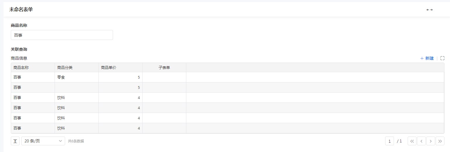 - 当关联查询为子表单字段时,仅新增数据页可展示;
