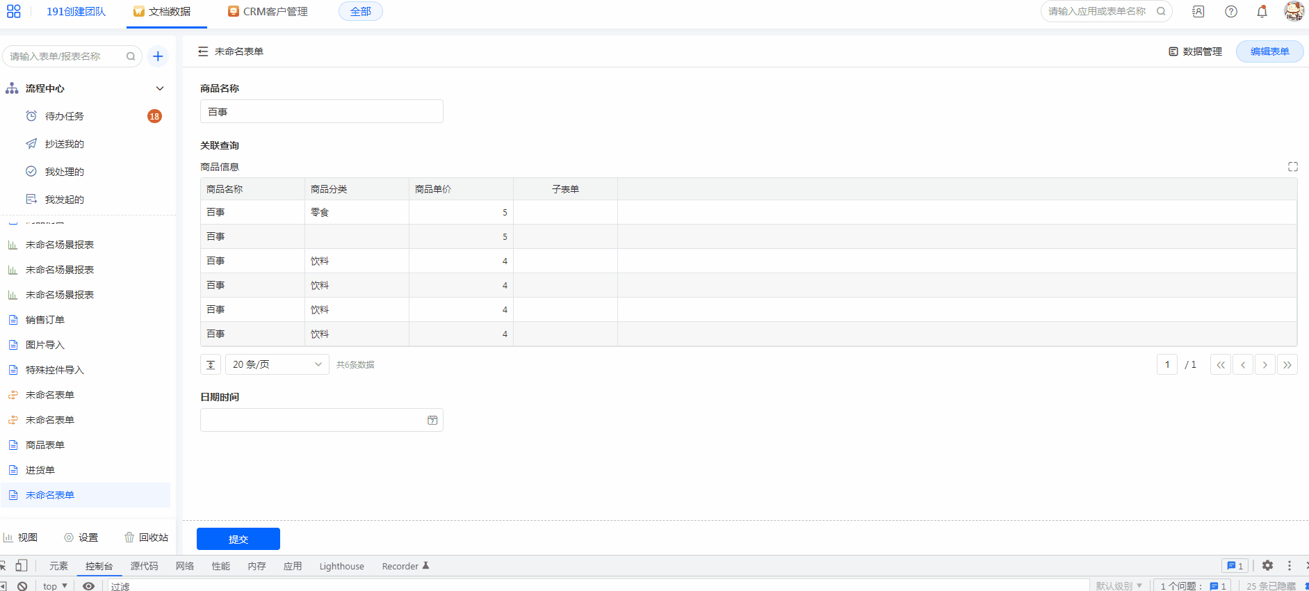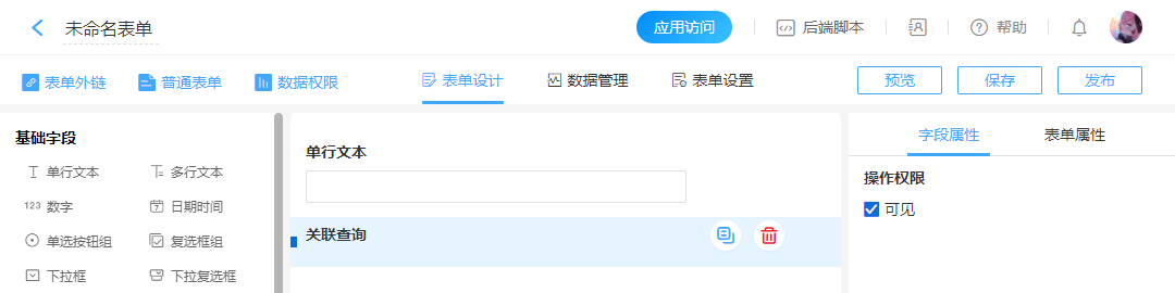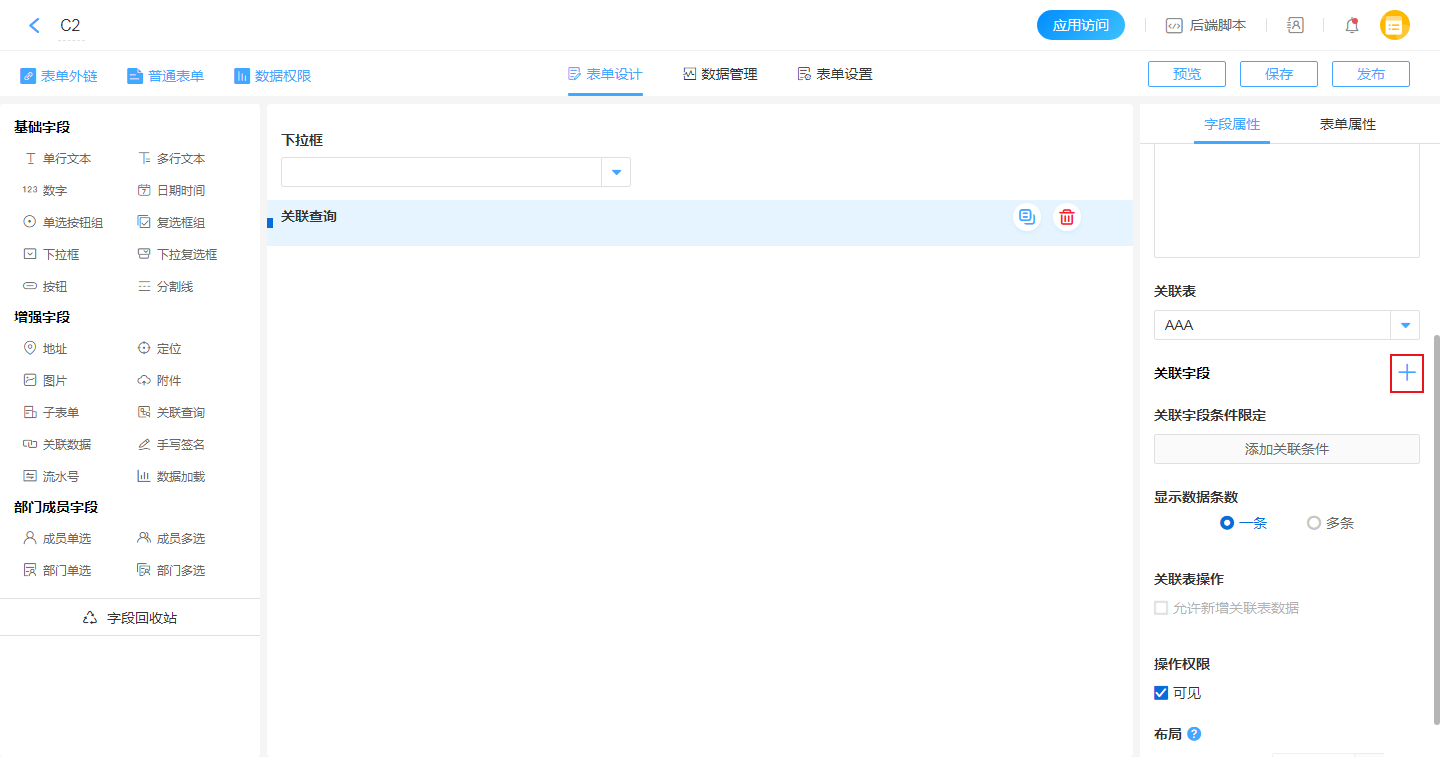 - 在表单设计页,预览和数据管理中,不可新增和查看关联表的数据。