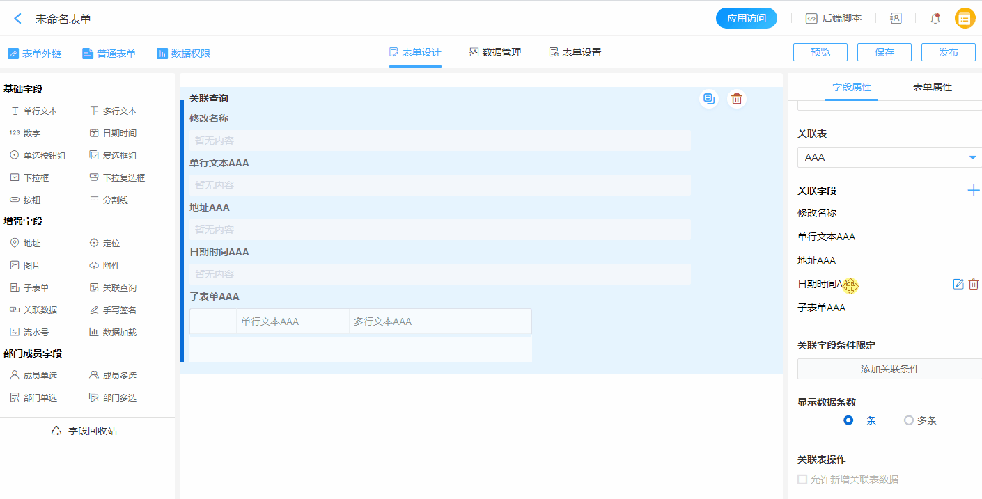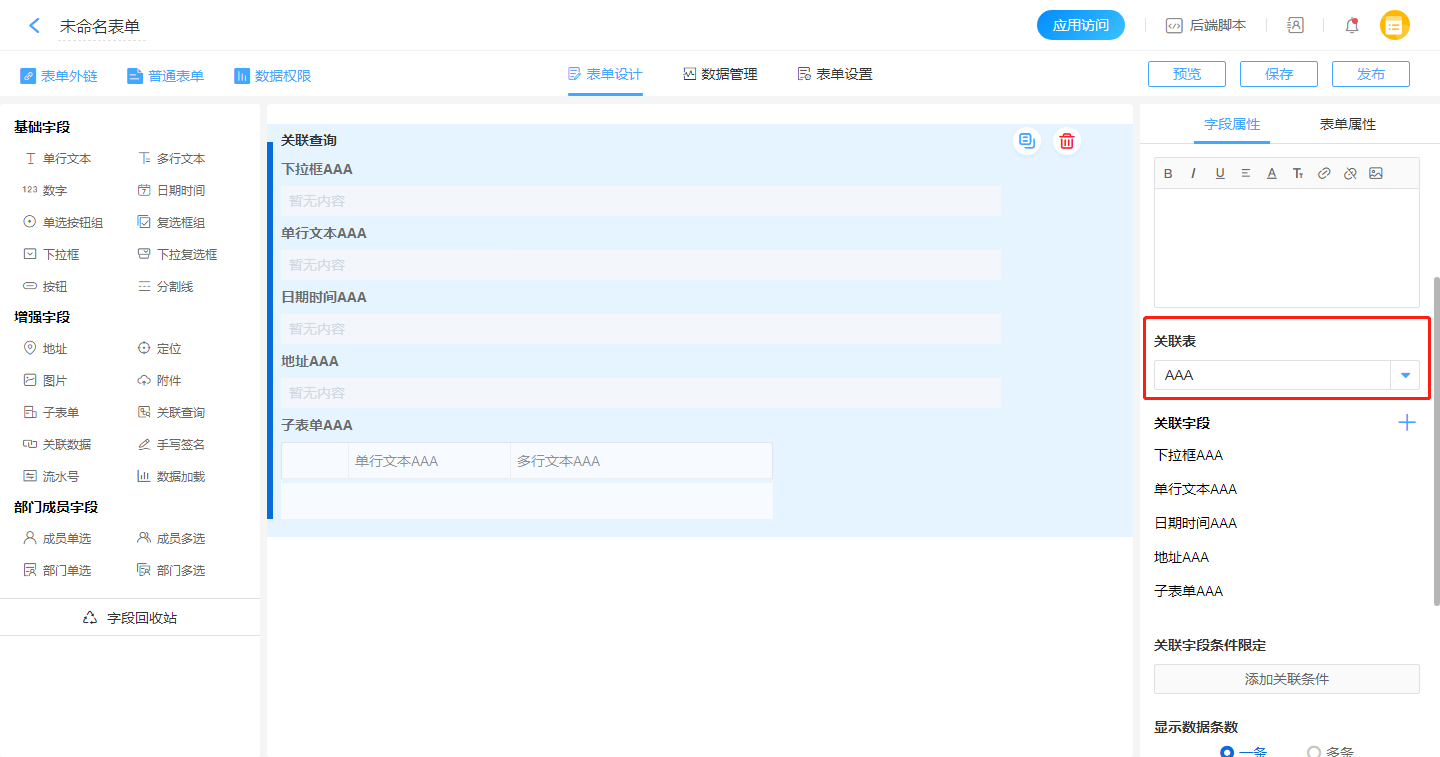 - 「关联查询」查询出的数据不会真实存入当前表单,在数据管理和数据表中不展示。