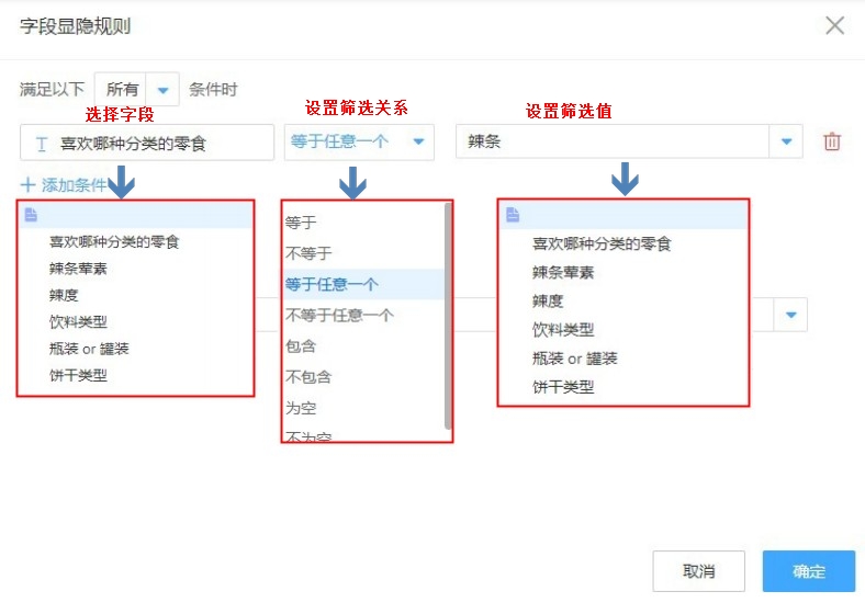 - 任意一个:满足其中任意一个条件即可显示后续字段。