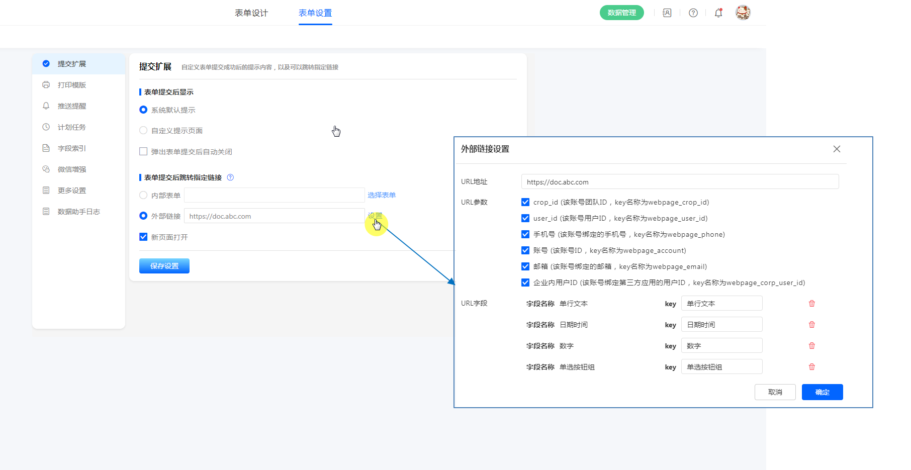 保存设置后,当此表单网页提交数据(非弹窗提交)时,自动跳转到设置的表单,并将字段值写入对应字段中。