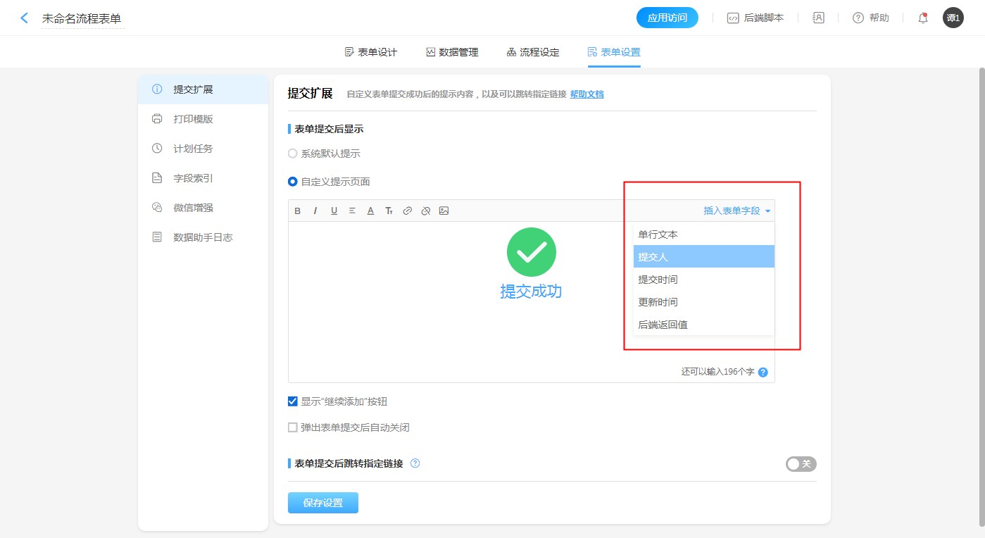 - 步骤:【应用管理】—【表单设计】—【表单设置】